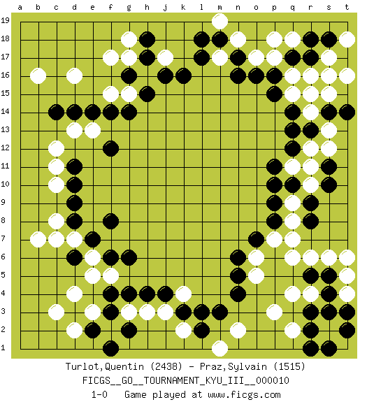 Last move : 1-0 2010 June 17 1:35:56 [Event "FICGS__GO__TOURNAMENT_KYU_III__000010"] [Site "FICGS"] [Date "2010.05.17"] [Round "1"] [Black "Turlot,Quentin"] [White "Praz,Sylvain"] [Result "1-0"] [Rating 1 "2438"] [Rating 2 "1515"] 1.p16 d16 2.d6 d4 3.f4 c3 4.f6 q4 5.r9 r16 6.q14 p17 7.q17 q16 8.r17 s17 9.s18 o17 10.o16 s16 11.n17 n18 12.m18 m17 13.n16 q18 14.r18 p18 15.l17 t18 16.c14 c12 17.e14 f17 18.d11 c11 19.d10 c10 20.d9 c8 21.d8 b7 22.n4 q6 23.o7 b16 24.h15 q8 25.p9 q9 26.q10 r10 27.p10 r11 28.q12 j17 29.k16 f15 30.f14 g15 31.g14 h16 32.j16 p3 33.k3 n2 34.m3 j3 35.j4 h3 36.h4 g3 37.f3 k2 38.l2 k4 39.l3 f2 40.e2 e3 41.g2 f5 42.g4 e5 43.g6 d7 44.e7 c7 45.h17 g17 46.h18 d13 47.d14 e13 48.f12 g18 49.g16 e6 50.f8 o5 51.n5 o6 52.n6 p7 53.p8 q15 54.p15 m19 55.l18 q11 56.p11 r12 57.r13 s13 58.s14 s12 59.r8 q7 60.s10 r14 61.r15 s15 62.t14 r14 63.q13 r15 64.s5 s6 65.r5 r6 66.r3 s2 67.r2 q2 68.r1 r4 69.s4 t5 70.t2 s3 71.s1 t4 72.t3 t6 73.s3 d2 74.f1 m1 75.t17 t16 76.s11 1-0 Here are the names of the openings (joseki) played in the four corners : Corner d4 : d6 d4 Ootakamoku (Chaogao) 6-4 Point. The large takamoku (high) point (6-4), experimented with during the "new fuseki" movement in Japan in the 1930's. This point is seldom played as the initial corner point nowadays. Corner q4 : q4 r9 Hoshi (Hwajeom, Seongjeom, Xingwei`) 4-4 Point. The star or hoshi (4-4) point, emphasizing influence at the potential expense of territory. Corner q16 : p16 r16 Takamoku (Gomok, Gaomu`) 5-4 Point. The takamoku (high) point (5-4). With its emphasis on influence, the 5-4 point complements the 4-4 (hoshi) point in creating an influence-oriented fuseki. Komoku. Black responds with 3-3, 3-5, 4-6, 4-7, 3-6, 3-7. Corner d16 : d16 c14 Hoshi (Hwajeom, Seongjeom, Xingwei`) 4-4 Point. The star or hoshi (4-4) point, emphasizing influence at the potential expense of territory. Ikken Kakari (Hankan Keolch'im, Yi Gua`jiao~, 1-Space Low Approach). Black 2 is the standard approach move to the 4-4. Player Black won this Go (weiqi, baduk) game. Follow this game move after move (download)One big eye kills one small eye. (Anonymous) I couldn't make any sense out of what this particular thread is about. It sounds like R2 D2 computer speaking. A space fight ?!? Some 'command' problems in Moscow ? Some killers & narcotic addicts attacking some game & a god wannabe ?? (Dinesh De Silva, lost in a russian conflict in FICGS forum)