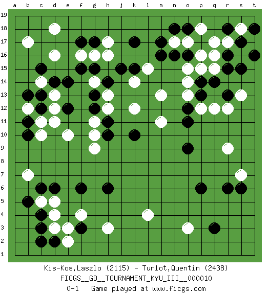 Last move : 0-1 2010 September 2 22:59:34 [Event "FICGS__GO__TOURNAMENT_KYU_III__000010"] [Site "FICGS"] [Date "2010.05.17"] [Round "1"] [Black "Kis-Kos,Laszlo"] [White "Turlot,Quentin"] [Result "0-1"] [Rating 1 "2115"] [Rating 2 "2438"] 1.r16 d4 2.q3 d16 3.p17 r9 4.r6 r12 5.f3 h3 6.c3 d3 7.c4 d5 8.d2 e2 9.c2 e3 10.c6 c14 11.k17 o3 12.p6 l4 13.f17 d18 14.d6 c10 15.f6 f4 16.c12 e10 17.e12 g10 18.e14 f16 19.g17 g14 20.g12 h12 21.f15 g16 22.g15 h16 23.h14 h17 24.h11 s16 25.s15 r17 26.s17 q16 27.r15 q17 28.o16 s18 29.t16 q15 30.q14 o15 31.p14 p15 32.m16 n17 33.n16 p18 34.o18 o17 35.n18 p16 36.m17 o14 37.r13 q12 38.t18 o13 39.p13 p12 40.o12 m13 41.o11 l15 42.k15 k14 43.j15 h13 44.g13 k12 45.h10 g9 46.h6 g11 47.k10 m11 48.o9 s13 49.r18 s7 50.s6 b12 51.b11 c11 52.b13 d12 53.c13 d13 54.d14 d11 55.c15 b17 56.b10 c5 57.b5 b7 0-1 This go game has been lost on time (started : 2010.05.17 10:32:44) Here are the names of the openings (joseki) played in the four corners : Corner q4 : q3 r9 Komoku (Somok, Xiao~mu`) 3-4 Point. The komoku (3-4) point is the traditional corner enclosure move.. Corner d4 : d4 f3 Hoshi (Hwajeom, Seongjeom, Xingwei`) 4-4 Point. The star or hoshi (4-4) point, emphasizing influence at the potential expense of territory. Ikken Kakari (Hankan Keolch'im, Yi Gua`jiao~, 1-Space Low Approach). Black 2 is the standard approach move to the 4-4. Player White won this Go (weiqi, baduk) game. Follow this game move after move (download)Learn the eye-stealing tesuji. (Anonymous) There is a great deal of difference between an eager man who wants to read a book and a tired man who wants a book to read. (G.K. Chesterton)
