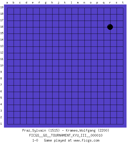 Last move : 1-0 2010 June 16 20:47:10 [Event "FICGS__GO__TOURNAMENT_KYU_III__000010"] [Site "FICGS"] [Date "2010.05.17"] [Round "1"] [Black "Praz,Sylvain"] [White "Krames,Wolfgang"] [Result "1-0"] [Rating 1 "1515"] [Rating 2 "2200"] 1.r16 1-0 This go game has been lost on time (started : 2010.05.17 10:32:44) Here are the names of the openings (joseki) played in the four corners : Player Black won this Go (weiqi, baduk) game. Follow this game move after move (download)Learn to play under the stones. (Anonymous) First of all, we have to go back to the classical time control. (Anatoly Karpov)