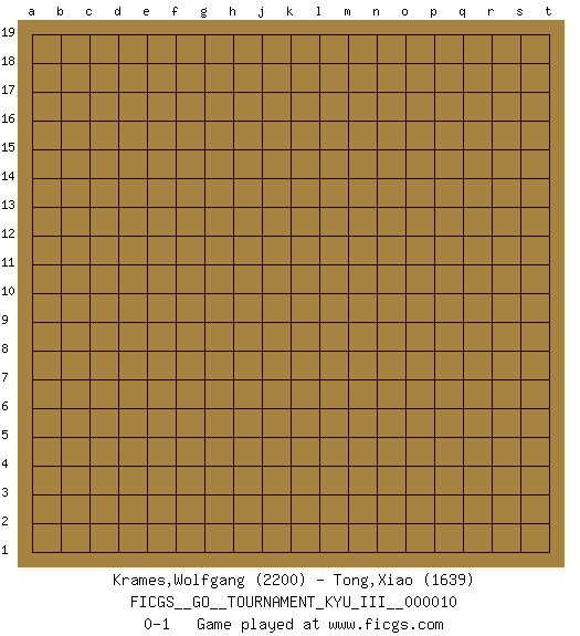 Last move : 0-1 2010 June 16 20:47:10 [Event "FICGS__GO__TOURNAMENT_KYU_III__000010"] [Site "FICGS"] [Date "2010.05.17"] [Round "1"] [Black "Krames,Wolfgang"] [White "Tong,Xiao"] [Result "0-1"] [Rating 1 "2200"] [Rating 2 "1639"] 0-1 This go game has been lost on time (started : 2010.05.17 10:32:44) Here are the names of the openings (joseki) played in the four corners : Player White won this Go (weiqi, baduk) game. Follow this game move after move (download)In the corner, five stones in a row on the third line are alive. (Anonymous) Hardware: the parts of a computer that can be kicked. (Jeff Persis)