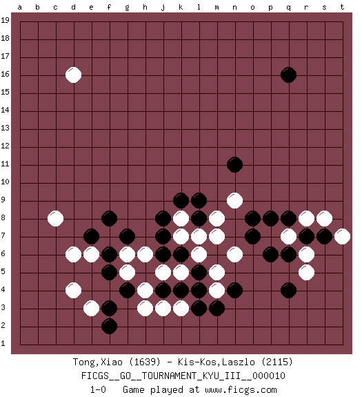 Last move : 1-0 2010 July 8 19:12:2 [Event "FICGS__GO__TOURNAMENT_KYU_III__000010"] [Site "FICGS"] [Date "2010.05.17"] [Round "1"] [Black "Tong,Xiao"] [White "Kis-Kos,Laszlo"] [Result "1-0"] [Rating 1 "1639"] [Rating 2 "2115"] 1.q16 d4 2.q4 d16 3.f3 h3 4.f5 d6 5.j4 j3 6.k4 k3 7.l4 h4 8.h5 g5 9.g4 g6 10.f6 f7 11.e7 e6 12.g7 h6 13.f8 j5 14.l3 e3 15.f2 c8 16.j8 l6 17.l8 n6 18.k6 k5 19.l5 k7 20.m6 l7 21.j7 m7 22.j6 m5 23.n4 m4 24.m3 r6 25.q6 q7 26.p6 p7 27.r7 r8 28.s7 r5 29.o7 s8 30.o8 k8 31.q8 t7 32.p8 q7 33.k9 m8 34.l9 n9 35.n11 1-0 Here are the names of the openings (joseki) played in the four corners : Corner d4 : d4 f3 Hoshi (Hwajeom, Seongjeom, Xingwei`) 4-4 Point. The star or hoshi (4-4) point, emphasizing influence at the potential expense of territory. Ikken Kakari (Hankan Keolch'im, Yi Gua`jiao~, 1-Space Low Approach). Black 2 is the standard approach move to the 4-4. Player Black won this Go (weiqi, baduk) game. Follow this game move after move (download)You can hide nothing on the goban. (Pierre Audouard) Cactus - It is depressed cucumber. (Ilmars Cirulis)