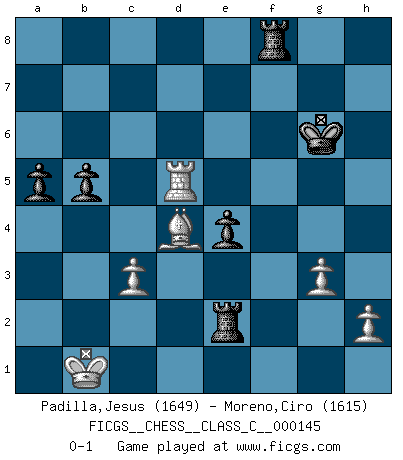 Last move : 0-1 2010 September 14 16:21:19 [Event "FICGS__CHESS__CLASS_C__000145"] [Site "FICGS"] [Date "2010.05.17"] [Round "1"] [White "Padilla,Jesus"] [Black "Moreno,Ciro"] [Result "0-1"] [WhiteElo "1649"] [BlackElo "1615"] 1.e4 c5 2.Nf3 e6 3.d4 cxd4 4.Nxd4 Nf6 5.Nc3 Bb4 6.e5 Qc7 7.exf6 Bxc3+ 8.bxc3 Qxc3+ 9.Qd2 Qxa1 10.c3 Qb1 11.fxg7 Rg8 12.Nb3 Qe4+ 13.Qe3 Qxe3+ 14.Bxe3 Rxg7 15.Nd4 d6 16.Nb5 Kd7 17.g3 Nc6 18.Bg2 a6 19.Nd4 Kc7 20.Ke2 Bd7 21.Rb1 b5 22.Nc2 f6 23.Nb4 a5 24.Nxc6 Bxc6 25.Bxc6 Kxc6 26.Kd3 d5 27.f4 e5 28.fxe5 fxe5 29.Rf1 Rg4 30.Rf6+ Kd7 31.Rf7+ Ke6 32.Rxh7 Ra4 33.Rh6+ Kf7 34.Rh5 e4+ 35.Kc2 Rxa2+ 36.Kb1 Re2 37.Bd4 Kg6 38.Rxd5 Rf8 0-1 Sicilian : Pin, Koch variation Player Black won this chess game. Follow this game move after move (download)All I want to do, ever, is just play Chess. (Bobby Fischer) Viele Opfer benötigen überhaupt keine konkrete Berechnung. Es genügt sich die entstehende Position kurz vorzustellen, um uns davon zu überzeugen, dass das Opfer korrekt ist. (Mikhail Nekhemyevich Tal) Los finales de Peón son del Ajedrez lo que el cesped es del Golf. (Cecil Purdy) Les échecs sont un jeu par leur forme, un art par leur essence et une science par sa difficulté d'acquisition. Ils peuvent vous procurer autant de plaisir qu'un bon livre ou une belle musique, mais vous n'aurez une réelle joie que si vous arrivez à bien jouer. (Tigran Petrosian) Without enthusiasm, virtue functions not at all, and vice only poorly. (Mignon McLaughlin, The Neurotic's Notebook, 1960)