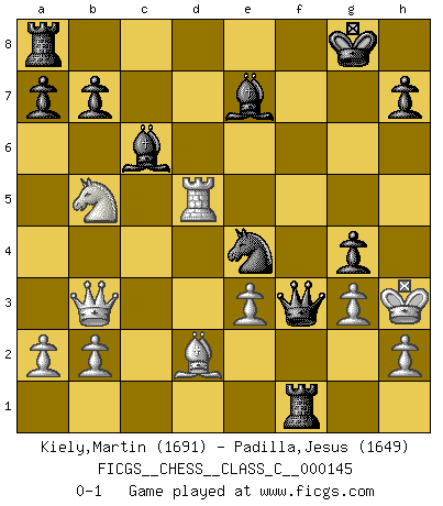 Last move : 0-1 2010 July 27 16:45:12 [Event "FICGS__CHESS__CLASS_C__000145"] [Site "FICGS"] [Date "2010.05.17"] [Round "1"] [White "Kiely,Martin"] [Black "Padilla,Jesus"] [Result "0-1"] [WhiteElo "1691"] [BlackElo "1649"] 1.d4 Nf6 2.c4 e6 3.Nc3 d5 4.e3 Be7 5.Nf3 c6 6.Be2 O-O 7.cxd5 cxd5 8.O-O Nc6 9.Ne5 Nxe5 10.dxe5 Nd7 11.f4 f6 12.g3 fxe5 13.Bd2 exf4 14.Rxf4 Nf6 15.Bf3 Bd7 16.Qb3 Bc6 17.Nb5 g5 18.Rd4 e5 19.Rd3 e4 20.Bxe4 Nxe4 21.Rf1 Rxf1+ 22.Kg2 Qf8 23.Rxd5 Qf3+ 24.Kh3 g4+ 0-1 Queen's pawn game Kingside Castling by player Black (move 6) Kingside Castling by player White (move 8) Player Black won this chess game. Follow this game move after move (download)Bobby Fischer is the greatest Chess genius of all time ! (Alexander Kotov) Die Partien sind immer verschieden, die Interviews immer die gleichen. (Garry Kasparov) Desconfianza es la característica mas necesaria de un jugador de Ajedrez. (Siegbert Tarrasch) Les Echecs, c'est l'art de la guerre sans les charniers, c'est la résurrection des morts tombés au champ d'honneur, l'espoir perpétuel, la suprématie de l'intelligence sur la force, la culture de l'esprit. (F. Szpiner) Fame, I have already. Now I need the money. (an elderly Steinitz)