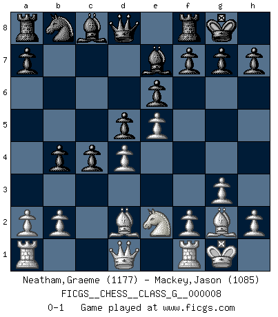 Last move : 0-1 2006 December 21 20:24:35 [Event "FICGS__CHESS__CLASS_G__000008"] [Site "FICGS"] [Date "2006.11.02"] [Round "1"] [White "Neatham,Graeme"] [Black "Mackey,Jason"] [Result "0-1"] [WhiteElo "1177"] [BlackElo "1085"] 1.c4 Nf6 2.g3 c6 3.Nc3 d5 4.d4 dxc4 5.e4 b5 6.Bg2 e6 7.Nge2 Be7 8.O-O O-O 9.e5 Nd5 10.Bd2 b4 11.Nxd5 cxd5 0-1 English, 1...Nf6 (Anglo-Indian defense) Kingside Castling by player White (move 8) Kingside Castling by player Black (move 8) Player Black won this chess game. Follow this game move after move (download)Chess is not like life... it has rules ! (Mark Pasternak) Wenn Capablanka heute auf der Schachbühne erscheinen würde, hätte er ein halbes Jahr gebraucht um sich die Schachtheorie anzueignen. Und dann hätte er alles und jeden besiegt. (Mikhail Moiseyevich Botvinik) En el Ajedrez, cuando menos, el valiente hereda la tierra. (Edmar Mednis) Psychologiquement, tu dois avoir confiance en toi même, mais cette confiance doit être basée sur des faits. (Robert Fischer) All battles are fought by scared men who'd rather be someplace else. (John Wayne in the movie In harm's way)