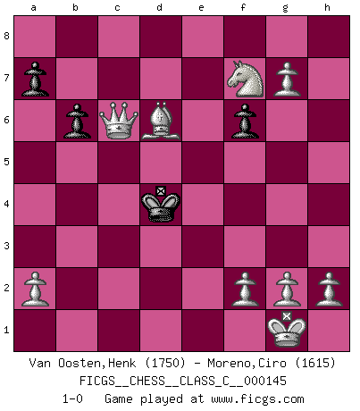 Last move : 1-0 2011 April 1 14:31:17 [Event "FICGS__CHESS__CLASS_C__000145"] [Site "FICGS"] [Date "2010.05.17"] [Round "1"] [White "Van Oosten,Henk"] [Black "Moreno,Ciro"] [Result "1-0"] [WhiteElo "1750"] [BlackElo "1615"] 1.e4 c5 2.Nf3 e6 3.d4 cxd4 4.Nxd4 Nf6 5.Nc3 Bb4 6.e5 Qc7 7.exf6 Bxc3+ 8.bxc3 Qxc3+ 9.Qd2 Qxa1 10.fxg7 Rg8 11.c3 Qb1 12.Bd3 Qb6 13.Qg5 Nc6 14.Bxh7 Ne7 15.Nb5 d6 16.Bxg8 Nxg8 17.Ba3 d5 18.Nd6+ Kd7 19.O-O f6 20.Qh5 Qd8 21.c4 Kc7 22.cxd5 Bd7 23.Rc1+ Kb8 24.Nf7 Qc7 25.Rxc7 Kxc7 26.dxe6 b6 27.Bd6+ Kb7 28.exd7 Kc6 29.Qf3+ Kxd7 30.Qxa8 Ke6 31.Qxg8 Kd5 32.Qa8+ Kd4 33.Qc6 1-0 This chess game has been lost on time (started : 2010.05.17 10:36:13) Sicilian : Pin, Koch variation Kingside Castling by player White (move 19) Player White won this chess game. Follow this game move after move (download)A win by an unsound combination, however showy, fills me with artistic horror. (Wilhelm Steinitz) Wenn Dein Gegner dir ein Remis anbietet, versuch herauszufinden, weshalb er glaubt schlechter zu stehen. (Nigel Short) El Ajedrez es el arte del análisis. (Mikhail Botvinnik) Le jeu d'échecs est comme rejeté hors du temps. (Antoine de Saint-Exupéry) Dave, my mind is going. I can feel it. (HAL 9000 in 2001, a space odyssey)
