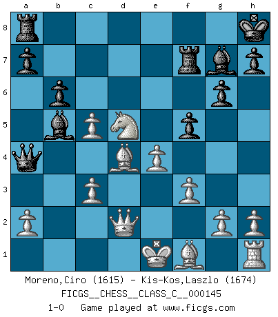 Last move : 1-0 2010 October 5 21:19:51 [Event "FICGS__CHESS__CLASS_C__000145"] [Site "FICGS"] [Date "2010.05.17"] [Round "1"] [White "Moreno,Ciro"] [Black "Kis-Kos,Laszlo"] [Result "1-0"] [WhiteElo "1615"] [BlackElo "1674"] 1.c4 Nf6 2.d4 g6 3.Nc3 d5 4.cxd5 Nxd5 5.e4 Nxc3 6.bxc3 Bg7 7.Nf3 c5 8.Rb1 O-O 9.Be3 Qa5 10.Qd2 b6 11.Rb5 Qa4 12.dxc5 Nc6 13.Nd4 Ba6 14.Nxc6 Bxb5 15.Nxe7+ Kh8 16.f3 f5 17.Bd4 Rf7 18.Nd5 1-0 This chess game has been lost on time (started : 2010.05.17 10:36:13) English, 1...Nf6 (Anglo-Indian defense) Kingside Castling by player Black (move 8) Player White won this chess game. Follow this game move after move (download)Chess is mental torture. (Garry Kasparov) Ich verstehe Aljechins Kombinationen ganz gut; aber woher er diese Angriffschancen bekommt und wie er die Eröffnung behandelt das ist für mich ein Buch mit sieben Siegeln. (Rudolf Spielmann) Me gusta decir que Bobby Fischer fue el mejor jugador que jamás haya existido. Pero lo que hizo de Fischer un genio, fue su habilidad de mezclar una frescura y pragmatismo Americano con ideas Rusas acerca de la estrategia. (Bruce Pandolfini) Les écrivains ont utilisé les échecs pour analyser les côtés extrêmes de la nature humaine. Dans ce cadre, les échecs offrent un champ d'expérimentation idéal. Mais on pourrait faire la même chose avec la peinture. Et là, en vous référant à Van Gogh, vous ne tirerez pas de conclusion définitive sur les peintres. (Gary Kasparov) Life is verb, not a noun. (Charlotte Perkins Gilman)
