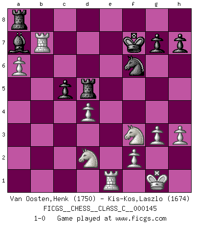 Last move : 1-0 2010 July 30 14:45:3 [Event "FICGS__CHESS__CLASS_C__000145"] [Site "FICGS"] [Date "2010.05.17"] [Round "1"] [White "Van Oosten,Henk"] [Black "Kis-Kos,Laszlo"] [Result "1-0"] [WhiteElo "1750"] [BlackElo "1674"] 1.e4 e5 2.Nf3 Nc6 3.Bc4 Nf6 4.d3 Bc5 5.c3 d6 6.Bb3 Be6 7.Bxe6 fxe6 8.b4 Bb6 9.O-O O-O 10.Qe2 a6 11.a4 d5 12.Ba3 Re8 13.Nbd2 Nh5 14.g3 Nf6 15.h3 Nd7 16.Rfb1 Rf8 17.a5 Ba7 18.b5 Ne7 19.d4 Rf6 20.Bxe7 Qxe7 21.bxa6 bxa6 22.Qxa6 exd4 23.cxd4 Qe8 24.Qc6 dxe4 25.Qxe4 Rf5 26.Re1 Rd5 27.a6 c5 28.Rab1 Nf6 29.Qxe6+ Qf7 30.Qxf7+ Kxf7 31.Rb7+ 1-0 Two knights defense (Modern Bishop's Opening) Kingside Castling by player White (move 9) Kingside Castling by player Black (move 9) Player White won this chess game. Follow this game move after move (download)The most important feature of the Chess position is the activity of the pieces. This is absolutely fundamental in all phases of the game: Opening, Middlegame and especially Endgame. The primary constraint on a piece's activity is the Pawn structure. (Michael Stean) Wie kann ich Remis annehmen? Ich weiß ja gar nicht, wie ich stehe! (Fritz Sämisch) El Ajedrez es el juego mas altamente simbólico, pero las agresiones estan por lo tanto aún mas francamente representadas en la partida. Tal vez comenzo como un juego de guerra; Algo como la representación de una batalla en miniatura entre las fuerzas de dos reinos. (Karl Meninger) Il vaut toujours mieux jouer un plan faux de façon logique que de n'avoir pas de plan du tout. (Victor Kortchnoï) Creativity involves breaking out of established patterns in order to look at things in a different way. (Edward De Bono)