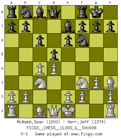 Last move : 0-1 2006 December 14 6:25:5 [Event "FICGS__CHESS__CLASS_G__000008"] [Site "FICGS"] [Date "2006.11.02"] [Round "1"] [White "McNabb,Sean"] [Black "Herr,Jeff"] [Result "0-1"] [WhiteElo "1200"] [BlackElo "1374"] 1.d4 d5 2.c4 c6 3.Nc3 Nf6 4.g3 e6 5.Bh3 Be7 6.Nf3 O-O 0-1 This chess game has been lost on time (started : 2006.11.02 8:40:20) QGD Slav defense Kingside Castling by player Black (move 6) Player Black won this chess game. Follow this game move after move (download)Fischer, who may or may not be mad as a hatter, has every right to be horrified. (Jeremy Silman) Korrekt heißt in Deutschland die Haltung eines Mannes, dessen Benehmen nach dem Urteile seiner Nachbarn seiner Stellung angemessen ist. Um korrekt zu sein, muß man sich der Meinung der anderen anpassen... (Emanuel Lasker) Fischer deseaba darle a los Rusos una sopa de su propia medicina. (Larry Evans) Nous sommes les pions de la mystérieuse partie d'Echecs jouée par Dieu. Il nous déplace, nous arrête, nous pousse encore, puis nous lance un à un dans la boîte du Néant. Epitaphe sur la tombe de David Janowsky (1868-1927). Methinks King Thibault should dub Marius Zubac a knight of the square board... I mean table, henceforth addressing him as Sir Marius, and bestow on him a suitable land from the kingdom of FICGS & marry him off to a worthy, fair maiden, lest he slice our heads with his mighty sword in his wrath. (Dinesh De Silva)