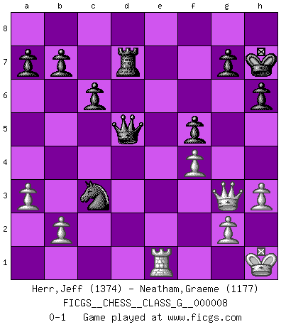 Last move : 0-1 2007 July 27 12:58:13 [Event "FICGS__CHESS__CLASS_G__000008"] [Site "FICGS"] [Date "2006.11.02"] [Round "1"] [White "Herr,Jeff"] [Black "Neatham,Graeme"] [Result "0-1"] [WhiteElo "1374"] [BlackElo "1177"] 1.d4 d5 2.c4 c6 3.e3 Nf6 4.Nf3 Bf5 5.Nc3 e6 6.Be2 Nbd7 7.O-O dxc4 8.Bxc4 Bd6 9.h3 O-O 10.Re1 Ne4 11.Nxe4 Bxe4 12.Nd2 Bg6 13.e4 Nb6 14.Bd3 Bb4 15.a3 Bxd2 16.Bxd2 Qxd4 17.Bc3 Qd6 18.Qc2 Rfd8 19.Rad1 Rd7 20.Qe2 Rad8 21.Bc2 Qc5 22.Rxd7 Rxd7 23.Kh1 h6 24.f3 Qc4 25.Qf2 f5 26.exf5 Bxf5 27.Bxf5 exf5 28.Qg3 Kh7 29.Qe5 Qd5 30.Qg3 Na4 31.f4 Nxc3 0-1 This chess game has been lost on time (started : 2006.11.02 8:40:20) QGD Slav defense Kingside Castling by player White (move 7) Kingside Castling by player Black (move 9) Player Black won this chess game. Follow this game move after move (download)What would Chess be without silly mistakes ? (Kurt Richter) Ich würde die 30 stärksten Spieler der USA im Simultanspiel besiegen. (José Raúl Capablanca) Vive, pierde y aprende al observar a tu oponente como ganar. (Amber Steenbock) En blitz, le Cavalier l'emporte sur le Fou. (Vlastimil Hort) He who laughs last probably does not get the joke. (Unknown)