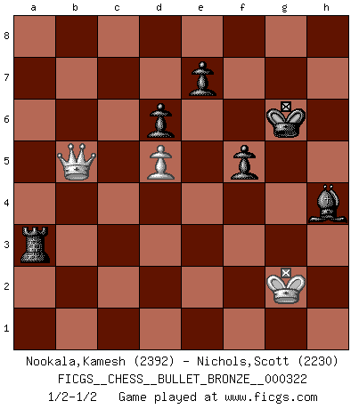 Last move : 1/2-1/2 2010 May 18 14:41:4 [Event "FICGS__CHESS__BULLET_BRONZE__000322"] [Site "FICGS"] [Date "2010.05.18"] [Round "1"] [White "Nookala,Kamesh"] [Black "Nichols,Scott"] [Result "1/2-1/2"] [WhiteElo "2392"] [BlackElo "2230"] 1.d4 Nf6 2.Nf3 g6 3.c4 Bg7 4.Nc3 O-O 5.e4 d6 6.Be2 c5 7.d5 Bg4 8.O-O Nbd7 9.h3 Bxf3 10.Bxf3 a6 11.Qc2 Qc7 12.Bg5 Rfc8 13.a3 Rab8 14.a4 h6 15.Bd2 h5 16.Rfd1 Ne8 17.Be2 Bd4 18.Bf1 Bg7 19.a5 b6 20.axb6 Qxb6 21.Rdb1 Rb7 22.b3 Rcb8 23.Ra3 Nc7 24.Qa2 Be5 25.Nb5 axb5 26.Ba5 Nxd5 27.exd5 Qa7 28.cxb5 Ra8 29.Bb4 Qxa3 30.Bxa3 Rba7 31.Qd2 Rxa3 32.b4 cxb4 33.Qxb4 R8a4 34.Qe1 Nb6 35.Rd1 Kg7 36.Kh1 Rc3 37.g3 h4 38.f4 Bf6 39.gxh4 Rxf4 40.h5 g5 41.Bg2 Kh6 42.Rc1 Ra3 43.Qe2 Nc4 44.Rb1 Be5 45.Qe1 Re3 46.Qg1 Bd4 47.Qd1 Rg3 48.Rb4 Ne3 49.Qe1 Bc5 50.Qxg3 Rxb4 51.Qe1 Kxh5 52.b6 Rxb6 53.Qa1 f6 54.Qa8 g4 55.hxg4+ Kxg4 56.Qg8+ Kf4 57.Qg6 Rb7 58.Qh6+ Ke5 59.Qg6 Rb4 60.Qh7 Kf4 61.Qh6+ Kg3 62.Qh2+ Kg4 63.Qh7 Rb2 64.Qh3+ Kg5 65.Bf3 Rb4 66.Qg3+ Kf5 67.Be2 Rf4 68.Bf3 Rd4 69.Qh2 Kg5 70.Qg3+ Ng4 71.Qe1 Ne5 72.Qg3+ Kf5 73.Bh5 Rf4 74.Kg2 Ng4 75.Qh3 Kg5 76.Bxg4 Rxg4+ 77.Kf3 Rf4+ 78.Kg3 Re4 79.Qh7 Re3+ 80.Kg2 Kf4 81.Kh2 Re4 82.Qh5 Re5 83.Qh4+ Kf3 84.Kh3 f5 85.Qh5+ Ke4 86.Qd1 Be3 87.Kg3 Bg5 88.Kh3 Bf6 89.Kg2 Kf4 90.Qf1+ Kg5 91.Kf2 Re4 92.Qg1+ Kh5 93.Kf3 Bg5 94.Qb1 Ra4 95.Qb3 Ra8 96.Qb2 Kg6 97.Qb3 Ra5 98.Kf2 Ra1 99.Kg2 Bh4 100.Qb5 Ra3 1/2-1/2 King's Indian : East Indian defense Kingside Castling by player Black (move 4) Kingside Castling by player White (move 8) 10 pieces endgame at move 76 : White KQBP , Black KRBPPP WHITE : King + 1 Queen 1 Bishop 1 Pawn BLACK : King + 1 Rook 1 Bishop 3 Pawns 9 pieces endgame at move 76 : White KQP , Black KRBPPP WHITE : King + 1 Queen 1 Pawn BLACK : King + 1 Rook 1 Bishop 3 Pawns This chess game ended in a draw. Follow this game move after move (download)Many Chess players were surprised when after the game, Fischer quietly explained: 'I had already analyzed this possibility' in a position which I thought was not possible to foresee from the opening. (Mikhail Tal) Kleine Schachspieler machen Mist, und große Schachspieler machen Mist, aber große machen weniger Mist. (Fritz Sämisch) Una clavada es mas poderosa que una espada. (Fred Reinfeld) Le jeu d'échecs est comme rejeté hors du temps. (Antoine de Saint-Exupéry) When you've done things right people won't know you've done anything at all. (Futurama)