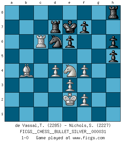 Last move : 1-0 2010 May 18 21:41:10 [Event "FICGS__CHESS__BULLET_SILVER__000031"] [Site "FICGS"] [Date "2010.05.18"] [Round "1"] [White "de Vassal,Thibault"] [Black "Nichols,Scott"] [Result "1-0"] [WhiteElo "2285"] [BlackElo "2227"] 1.d4 d5 2.c4 Nc6 3.Nf3 Bg4 4.cxd5 Bxf3 5.gxf3 Qxd5 6.e3 e6 7.Nc3 Qd7 8.f4 O-O-O 9.Bd2 Nf6 10.Rg1 a6 11.a3 h6 12.h4 g6 13.b4 Kb8 14.b5 axb5 15.Bxb5 Qd6 16.Rb1 Be7 17.Ke2 Na7 18.Qb3 Nxb5 19.Qxb5 b6 20.a4 Qd7 21.Qc4 Ne8 22.a5 Nd6 23.Qa6 Qc6 24.h5 gxh5 25.axb6 Qc4+ 26.Qxc4 Nxc4 27.bxc7+ Kxc7 28.Rgc1 Kd7 29.Rb7+ Ke8 30.Ne4 Nd6 31.Rxe7+ Kxe7 32.Bb4 Rd7 33.Rc6 1-0 QGD : Chigorin defense Queenside Castling by player Black (move 8) Player White won this chess game. Follow this game move after move (download)Chess, like any creative activity, can exist only through the combined efforts of those who have creative talent, and those who have the ability to organize their creative work. (Mikhail Botvinnik) Frage des Reporters: -Welche besonderen Umstände rechtfertigen das Anhalten der Uhren während einer Turnierpartie? Antwort: -Einen Fotographen zu strangulieren. (Siegbert Tarrasch) Cuando tengo las piezas blancas, yo gano porque soy blanco; Cuando tengo las piezas negras, yo gano porque soy Bogolyubov. (Bogolyubov) Karpov est une pièce de musée. (Garry Kasparov) The real voyage of discovery consists not in seeking new lands but in seeing with new eyes. (Marcel Proust)