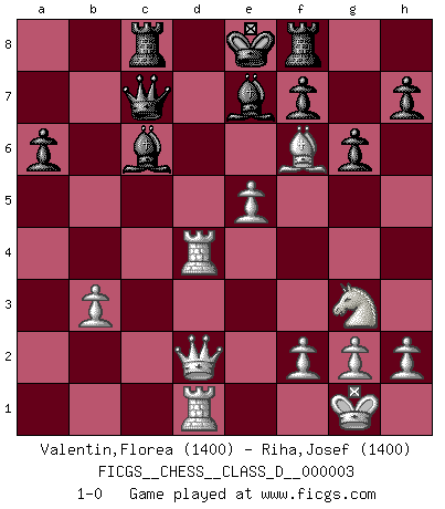 Last move : 1-0 2006 May 16 21:14:59 [Event "FICGS__CHESS__CLASS_D__000003"] [Site "FICGS"] [Date "2006.04.26"] [Round "1"] [White "Valentin,Florea"] [Black "Riha,Josef"] [Result "1-0"] [WhiteElo "1400"] [BlackElo "1400"] 1.e4 c5 2.Nf3 e6 3.d4 cxd4 4.Nxd4 a6 5.Nc3 Nc6 6.Nxc6 bxc6 7.Bd3 d5 8.O-O Nf6 9.Bf4 Bc5 10.e5 Nd7 11.Qg4 g6 12.Na4 Be7 13.Rfe1 Qc7 14.Qg3 Bb7 15.Bh6 c5 16.c4 Bc6 17.cxd5 exd5 18.Nc3 c4 19.Bc2 Nc5 20.b3 cxb3 21.Bxb3 Nxb3 22.axb3 Qd7 23.Ne2 d4 24.Rad1 Bb4 25.Rxd4 Qb7 26.Red1 Be7 27.Bg7 Rg8 28.Bf6 Rc8 29.Qg5 Rf8 30.Qd2 Qc7 31.Ng3 1-0 Sicilian : Kan, 5.Nc3 Kingside Castling by player White (move 8) Player White won this chess game. Follow this game move after move (download)There are tough players and nice guys, and I'm a tough player. (Bobby Fischer) Es genügt nicht ein guter Spieler zu sein, man muß auch gut spielen. (Siegbert Tarrasch) El Ajedrez es parte de una cultura y si una cultura esta en decadencia, entonces también el Ajedrez declinará. (Mikhail Botvinnik) Les échecs, c'est l'art d'analyser. (Mikhail Botvinnik) Winning isn't everything... but losing is nothing. (Mednis)