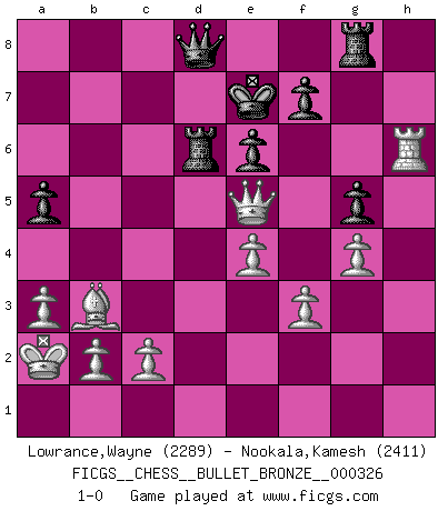 Last move : 1-0 2010 May 18 22:11:52 [Event "FICGS__CHESS__BULLET_BRONZE__000326"] [Site "FICGS"] [Date "2010.05.18"] [Round "1"] [White "Lowrance,Wayne"] [Black "Nookala,Kamesh"] [Result "1-0"] [WhiteElo "2289"] [BlackElo "2411"] 1.e4 c5 2.Nf3 d6 3.d4 cxd4 4.Nxd4 Nf6 5.Nc3 a6 6.Be3 e6 7.f3 b5 8.Qd2 Nbd7 9.g4 b4 10.Na4 h6 11.O-O-O Ne5 12.Qxb4 Bd7 13.Bf4 g5 14.Bd2 Rb8 15.Qa3 a5 16.Bc3 Qc7 17.Be1 Qa7 18.h4 Rg8 19.hxg5 hxg5 20.Bg3 Rb4 21.Qc3 Rxa4 22.Nb5 Qb6 23.Nxd6+ Bxd6 24.Bxe5 Bxe5 25.Qxe5 Ke7 26.a3 Be8 27.Rh6 Nd7 28.Qc3 Kf8 29.Be2 Nb8 30.Qb3 Qc7 31.Kb1 Bd7 32.Rxd7 Qxd7 33.Qxb8+ Kg7 34.Qh2 Rd4 35.Rh7+ Kf8 36.Qe5 Ke7 37.Rh6 Rd2 38.Bb5 Qd8 39.Ba4 Rd4 40.Bb3 Rd6 41.Ka2 1-0 Sicilian : Najdorf, Byrne (English) attack Queenside Castling by player White (move 11) Player White won this chess game. Follow this game move after move (download)Modern Chess is too much concerned with things like Pawn structure. Forget it, Checkmate ends the game. (Nigel Short) Ich suche im Schach immer etwas Eigenes. Riskantes Spiel im Stile schachlicher Musketiere ist nicht meine Sache, auch wenn es vielen Freunden scharfer Wendungen gefällt. (Anatoly Karpov) Yo nunca en mi vida he jugado la Defensa Francesa, que viene siendo la más aburrida de todas las Aperturas. (Wilhelm Steinitz) Donnez-moi un Cavalier en 6e et je gagnerais toutes mes parties. (Steinitz) Hold em is to stud what chess is to checkers. (Johnny Moss)