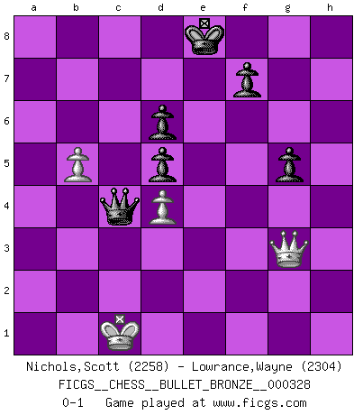 Last move : 0-1 2010 May 19 17:14:55 [Event "FICGS__CHESS__BULLET_BRONZE__000328"] [Site "FICGS"] [Date "2010.05.19"] [Round "1"] [White "Nichols,Scott"] [Black "Lowrance,Wayne"] [Result "0-1"] [WhiteElo "2258"] [BlackElo "2304"] 1.b4 d5 2.Bb2 Nf6 3.Nf3 e6 4.g3 Bxb4 5.Bg2 O-O 6.O-O Nc6 7.a3 Be7 8.d4 b5 9.Nbd2 a5 10.Ne1 Ba6 11.Nd3 b4 12.axb4 axb4 13.Nb3 Ne4 14.e3 Bc4 15.Qe2 Qd7 16.Rfe1 Rfb8 17.f3 Nd6 18.Qd2 Rxa1 19.Rxa1 Qe8 20.Qe1 h6 21.f4 Ne4 22.Nf2 Nxf2 23.Kxf2 Ra8 24.e4 dxe4 25.Bxe4 Bd5 26.Bxd5 exd5 27.Rxa8 Qxa8 28.Qe2 Qa2 29.Bc1 Bf8 30.f5 Na7 31.Ke1 Qa4 32.Bf4 Qc6 33.Kd1 Nb5 34.Bd2 Na3 35.Bf4 Bd6 36.Bxd6 cxd6 37.Qd3 Nb1 38.Ke2 Qe8+ 39.Kd1 Nc3+ 40.Kd2 Ne4+ 41.Kc1 Qa4 42.Qe3 Qa3+ 43.Kd1 Qb2 44.h3 Nc3+ 45.Kd2 Kf8 46.Qe1 Ne4+ 47.Kd1 h5 48.g4 hxg4 49.hxg4 Qb1+ 50.Nc1 b3 51.cxb3 Qb2 52.Qe3 Qg2 53.g5 Nxg5 54.Qf4 Ne4 55.Ne2 Ke8 56.Qe3 Qf1+ 57.Kc2 Qxf5 58.Qd3 Qf2 59.b4 g5 60.b5 Ng3 61.Qxg3 Qxe2+ 62.Kc1 Qc4+ 0-1 Polish (Sokolsky) opening Kingside Castling by player Black (move 5) Kingside Castling by player White (move 6) 10 pieces endgame at move 61 : White KQPP , Black KQPPPP WHITE : King + 1 Queen 2 Pawns BLACK : King + 1 Queen 4 Pawns Player Black won this chess game. Follow this game move after move (download)The hallmark of the artist is simplicity. (Larry Evans) Ja, jede Frau in Holland liebt mich bestimmt, und alle Männer hassen mich. (Loek van Wely) Solo existe una cosa que Fischer hace en el Ajedrez sin placer: ¡perder!. (Boris Spassky) Les échecs sont plus proches de l'art de l'assassinat que de l'art de la guerre. (Arturo Perez-Reverte) All men can see these tactics whereby I conquer, but what none can see is the strategy out of which victory is evolved. (Sun Tzu)