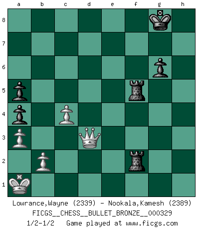 Last move : 1/2-1/2 2010 May 19 18:35:6 [Event "FICGS__CHESS__BULLET_BRONZE__000329"] [Site "FICGS"] [Date "2010.05.19"] [Round "1"] [White "Lowrance,Wayne"] [Black "Nookala,Kamesh"] [Result "1/2-1/2"] [WhiteElo "2339"] [BlackElo "2389"] 1.e4 c5 2.Nf3 d6 3.d4 cxd4 4.Nxd4 Nf6 5.Nc3 a6 6.Be3 e5 7.Nb3 Be6 8.f3 Be7 9.Qd2 O-O 10.O-O-O Nbd7 11.g4 b5 12.a3 Nb6 13.g5 Nh5 14.Na5 Rc8 15.Kb1 g6 16.h4 Ng3 17.Rh2 Nxf1 18.Rxf1 Na4 19.Nxa4 bxa4 20.Rd1 Qc7 21.h5 d5 22.exd5 Bxd5 23.hxg6 Bxf3 24.gxh7+ Kh8 25.Rc1 Rb8 26.Ka1 Rfd8 27.Qe1 Rb5 28.Rh3 e4 29.Rxf3 exf3 30.Nc6 Qxc6 31.Bd4+ Rxd4 32.Qxe7 Qe6 33.Qf8+ Kxh7 34.Rh1+ Kg6 35.Rh6+ Kf5 36.Rxe6 Kxe6 37.g6 fxg6 38.Qxf3 Re5 39.Qh3+ Rf5 40.c3 Rdf4 41.Qd3 a5 42.Qa6+ Kf7 43.c4 Kg7 44.Qe6 Kh6 45.Qe3 Kh7 46.Qh3+ Kg8 47.Qd3 Rf2 1/2-1/2 Sicilian : Najdorf, Byrne (English) attack Kingside Castling by player Black (move 9) Queenside Castling by player White (move 10) This chess game ended in a draw. Follow this game move after move (download)Spassky will not be psyched out by Fischer. (Mike Goodall) Ich liebe den Moment, wenn ich das Ego meines Gegenüber breche. (Robert James Fischer) El juego de Fischer siempre fue nítido, racional y brillante. Uno de los mejores por siempre. (Dave Regis) A chaque perte on perd un peu de soi. (Joël Lautier) After growing wildly for years, the field of computing appears to be reaching its infancy. (John Pierce)