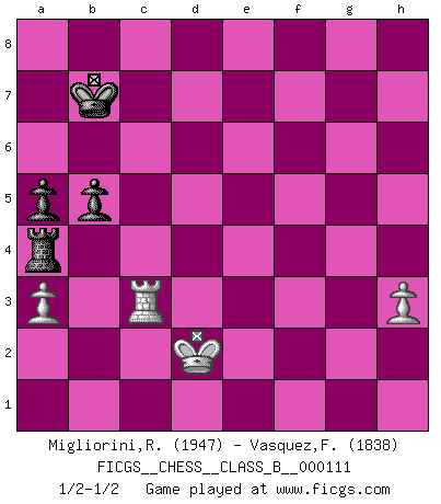Last move : 1/2-1/2 2011 April 15 19:44:31 [Event "FICGS__CHESS__CLASS_B__000111"] [Site "FICGS"] [Date "2010.05.19"] [Round "1"] [White "Migliorini,Roberto"] [Black "Vasquez,Fernando"] [Result "1/2-1/2"] [WhiteElo "1947"] [BlackElo "1838"] 1.e4 e5 2.Bc4 Nf6 3.d3 Bc5 4.Nf3 Nc6 5.Nc3 d6 6.Bg5 Nd4 7.Na4 h6 8.Bh4 Nxf3+ 9.Qxf3 g5 10.Nxc5 gxh4 11.Nb3 Qe7 12.h3 Be6 13.Bxe6 fxe6 14.O-O-O O-O-O 15.Rhg1 Rdf8 16.Qe3 Kb8 17.d4 Nd7 18.dxe5 Nxe5 19.Nd4 Rhg8 20.f4 Rg3 21.Qf2 Qf6 22.Ne2 Rg7 23.Rdf1 Nd7 24.Qf3 Nc5 25.Qe3 Rfg8 26.e5 Qf8 27.exd6 cxd6 28.Rf2 Qf5 29.Nc3 b6 30.Qd2 d5 31.Re1 Rg3 32.R1e2 Rc8 33.Qd4 Rc6 34.Qh8+ Rc8 35.Qxh6 d4 36.Qxh4 Rcg8 37.Re5 Nd3+ 38.cxd3 Qxd3 39.f5 dxc3 40.Qf4 Kb7 41.Rxe6 Rxg2 42.Qf3+ Qxf3 43.Rxf3 Rxb2 44.Rg6 Re8 45.Re6 Rxe6 46.fxe6 Re2 47.Rxc3 Rxe6 48.Kd2 Re4 49.Ra3 b5 50.Kd3 Rc4 51.Rc3 Ra4 52.a3 a5 53.Kd2 1/2-1/2 Bishop's Opening : Berlin defense Queenside Castling by player White (move 14) Queenside Castling by player Black (move 14) 10 pieces endgame at move 46 : White KRPPP , Black KRPPP WHITE : King + 1 Rook 3 Pawns BLACK : King + 1 Rook 3 Pawns 9 pieces endgame at move 47 : White KRPPP , Black KRPP WHITE : King + 1 Rook 3 Pawns BLACK : King + 1 Rook 2 Pawns 8 pieces endgame at move 47 : White KRPP , Black KRPP WHITE : King + 1 Rook 2 Pawns BLACK : King + 1 Rook 2 Pawns This chess game ended in a draw. Follow this game move after move (download)White lost because he failed to remember the right continuation and had to think up the moves himself. (Siegbert Tarrasch) Ein Buch ist ein Spiegel; wenn ein Affe hineinsieht, so kann kein Apostel heraus gucken. (Georg Christoph Lichtenberg) Un Peón pasado aumenta su poder a medida de que el número de piezas en el tablero disminuye. (Capablanca) Comme les marins qui ont mille raisons différentes d'aller en mer, les joueurs d'échecs en ont tout autant avant de s'installer devant une table et jouer... (Vincent Bertignac, philosophe) Wisdom begins at the end. (Daniel Webster)