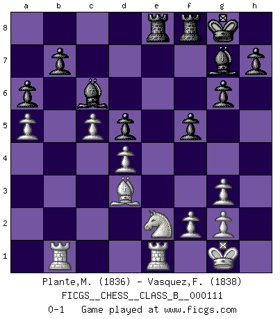 Last move : 0-1 2011 January 15 23:6:35 [Event "FICGS__CHESS__CLASS_B__000111"] [Site "FICGS"] [Date "2010.05.19"] [Round "1"] [White "Plante,Marc-Eric"] [Black "Vasquez,Fernando"] [Result "0-1"] [WhiteElo "1836"] [BlackElo "1838"] 1.e4 e5 2.Nf3 Nf6 3.d4 Nxe4 4.Bd3 d5 5.Nxe5 Nd7 6.Nxd7 Bxd7 7.O-O Be7 8.c4 Nf6 9.Nc3 Be6 10.c5 O-O 11.Bf4 c6 12.b4 g6 13.Re1 Nh5 14.Be5 f6 15.Bg3 Qd7 16.Qe2 Kf7 17.Qd2 Nxg3 18.hxg3 f5 19.Qh6 Bf6 20.Ne2 Kg8 21.a4 Qg7 22.Qxg7+ Bxg7 23.b5 Bd7 24.bxc6 Bxc6 25.a5 a6 26.Rab1 Rae8 0-1 This chess game has been lost on time (started : 2010.05.19 20:0:15) Petrov : Modern attack, Symmetrical variation Kingside Castling by player White (move 7) Kingside Castling by player Black (move 10) Player Black won this chess game. Follow this game move after move (download)Chess is imagination. (David Bronstein) Ich rechne überhaupt nicht voraus. Ich gewinne auch so. (Robert James Fischer) Repentinamente, me resultaba obvio en mi analisis que yo habÃa pasado por alto lo que Fischer habÃa visto en el tablero con la mas grande facilidad. (Mikhail Botvinnik) Roi des jeux et jeu des rois, les échecs portent en eux un sentiment d'infini. Ils donnent à celui qui s'est efforcé d'en approfondir les arcanes l'impression de n'être pas à la mesure de l'homme; en fait, ils constituent un résumé de l'univers, un microcosme, et figurent cette grande échelle qui, dans les plans de la lumière descend jusqu'à la matière, qui des abîmes insondables remonte jusqu'en l'infini de Dieu. (Pyrame) Perfection is achieved, not when there is nothing more to add, but when there is nothing left to take away. (Antoine de Saint-Exupéry)