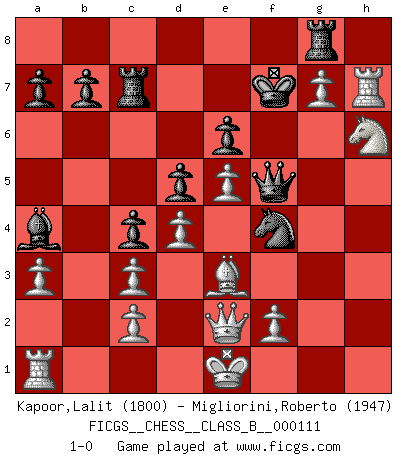 Last move : 1-0 2010 July 2 17:3:24 [Event "FICGS__CHESS__CLASS_B__000111"] [Site "FICGS"] [Date "2010.05.19"] [Round "1"] [White "Kapoor,Lalit"] [Black "Migliorini,Roberto"] [Result "1-0"] [WhiteElo "1800"] [BlackElo "1947"] 1.e4 e6 2.d4 d5 3.Nc3 Bb4 4.e5 c5 5.a3 Bxc3+ 6.bxc3 Ne7 7.Qg4 O-O 8.Bd3 Nbc6 9.Qh5 Ng6 10.Nf3 Qc7 11.Be3 c4 12.Bxg6 fxg6 13.Qg4 Qf7 14.Ng5 Qf5 15.Qe2 Re8 16.h4 h6 17.g4 Qf8 18.Nh3 Re7 19.h5 Rf7 20.hxg6 Rc7 21.g5 Qf5 22.gxh6 Ne7 23.Nf4 Nxg6 24.Nh5 Bd7 25.hxg7 Ba4 26.Nf6+ Kf7 27.Rh7 Rg8 28.Ng4 Nf4 29.Nh6+ 1-0 French : Winawer, Advance, poisoned pawn variation Kingside Castling by player Black (move 7) Player White won this chess game. Follow this game move after move (download)Before the endgame, the Gods have placed the middle game. (Siegbert Tarrasch) Ich verstehe mehr vom Schach als irgendein anderer lebender Meister. (José Raúl Capablanca) ¿Esta Bobby Fischer algo cuerdo?. (Salo Flohr) Les pièces de l'échiquier étaient impitoyables. Elles le retenaient, elles l'absorbaient. Il y avait de l'horreur en cela, mais aussi une harmonie unique. Car, qu'y a-t-il dans le monde, à part les échecs ? (V. Nabokov) If everyone is thinking alike, then somebody isn't thinking. (US General George S. Patton)