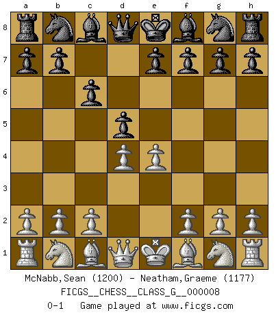 Last move : 0-1 2006 December 19 13:0:50 [Event "FICGS__CHESS__CLASS_G__000008"] [Site "FICGS"] [Date "2006.11.02"] [Round "1"] [White "McNabb,Sean"] [Black "Neatham,Graeme"] [Result "0-1"] [WhiteElo "1200"] [BlackElo "1177"] 1.d4 c6 2.e4 d5 0-1 This chess game has been lost on time (started : 2006.11.02 8:40:20) Queen's pawn Player Black won this chess game. Follow this game move after move (download)The game of chess is the touchstone of the intellect. (Goethe) Wenn Spassky eine Figur opfert kannst du genauso gut aufgeben. Aber wenn Tal eine Figur opfert, spiel weiter. Er könnte noch eine weitere opfern, und dann ... wer weiß? (Miguel Najdorf) Yo tuve un dolor de muelas en la primer partida. En el segundo juego, tuve un dolor de cabeza. En el tercero, tuve un ataque de reumatísmo. En la cuarta partida, no me sentía muy bien. ¿Y en el quinto juego? Bueno, ¿que acaso uno tiene que ganar todos los juegos?. (Siegbert Tarrasch) Tous ces prétendus hommes politiques sont les pions, les Cavaliers, les Tours ou les Fous d'une partie d'échecs qui se jouera tant qu'un hasard ne renversera pas l'échiquier. (Honoré de Balzac) Before all elsed, be armed. (Niccolo Machiavelli)