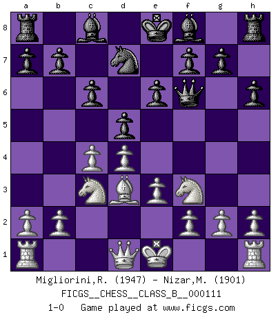 Last move : 1-0 2010 July 5 9:21:31 [Event "FICGS__CHESS__CLASS_B__000111"] [Site "FICGS"] [Date "2010.05.19"] [Round "1"] [White "Migliorini,Roberto"] [Black "Nizar,Muhammad"] [Result "1-0"] [WhiteElo "1947"] [BlackElo "1901"] 1.d4 d5 2.c4 c6 3.Nf3 Nf6 4.Nc3 e6 5.Bg5 h6 6.Bxf6 Qxf6 7.e3 Nd7 8.Bd3 1-0 This chess game has been lost on time (started : 2010.05.19 20:0:15) QGD Slav : 4.Nc3 Player White won this chess game. Follow this game move after move (download)If your opponent cannot do anything active, then don't rush the position; instead you should let him sit there, suffer, and beg you for a draw. (Jeremy Silman) Er war ein guter Schachspieler, aber ich kann Leute nicht ausstehen, die 'Heil Hitler' rufen (Über Alexander Aljechin). (Miguel Najdorf) Preferería tener un Peón que un dedo. (Reuben Fine) Toutes les manuvres exécutées sur une colonne ouverte ont pour but ultime l'intrusion définitive sur la septième ou la huitième rangée, en plein cur de la position ennemie. (Aaron Nimzovitch) At work, the authority of a person is inversely proportional to the number of pens that person is carrying. (Dan Rotaru)