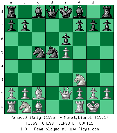 Last move : 1-0 2010 August 16 10:44:43 [Event "FICGS__CHESS__CLASS_B__000111"] [Site "FICGS"] [Date "2010.05.19"] [Round "1"] [White "Panov,Dmitriy"] [Black "Morat,Lionel"] [Result "1-0"] [WhiteElo "1995"] [BlackElo "1971"] 1.e4 c5 2.c3 Nf6 3.e5 Nd5 4.d4 cxd4 5.cxd4 d6 6.Nf3 e6 7.Bc4 Nb6 8.Bd3 dxe5 9.dxe5 N8d7 10.Qe2 Nc5 11.Bc2 Nd5 12.O-O 1-0 This chess game has been lost on time (started : 2010.05.19 20:0:15) Sicilian : Alapin's variation (2.c3) Kingside Castling by player White (move 12) Player White won this chess game. Follow this game move after move (download)If your opponent offers you a draw, try to work out why he thinks he's worse off. (Nigel Short) Schach ist ein Teil der Kultur, und wenn es mit der Kultur abwärts geht, geht es auch mit dem Schach abwärts. (Mikhail Moiseyevich Botvinik) Las combinaciones han sido siempre el aspecto más intrigante del Ajedrez. Los Maestros las buscan, el público las aplauden, los críticos las alaban. La razón se debe a que las combinaciones hacen posible que el Ajedrez sea más que un ejercicio matemático con una carencia de vida. Ellas son la poesía del juego, son del Ajedrez lo que la melodía es de la música. Ellas representan el triunfo de la mente sobre la materia. (Reuben Fine) A chaque perte on perd un peu de soi. (Joël Lautier) They misunderestimated me. (George W. Bush, Bentonville nov. 6, 2000)