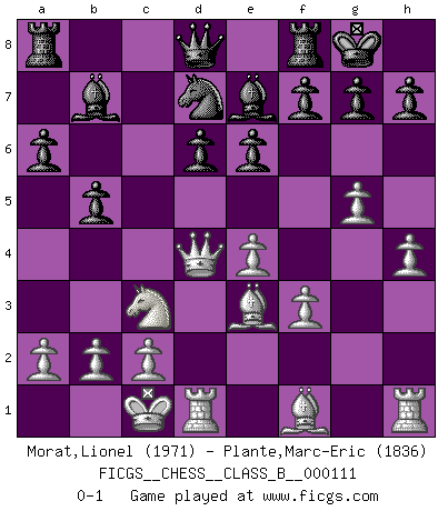 Last move : 0-1 2010 September 26 21:15:53 [Event "FICGS__CHESS__CLASS_B__000111"] [Site "FICGS"] [Date "2010.05.19"] [Round "1"] [White "Morat,Lionel"] [Black "Plante,Marc-Eric"] [Result "0-1"] [WhiteElo "1971"] [BlackElo "1836"] 1.e4 c5 2.Nf3 d6 3.d4 cxd4 4.Nxd4 Nf6 5.Nc3 a6 6.Be3 Nc6 7.f3 e6 8.Qd2 Be7 9.O-O-O O-O 10.g4 Nxd4 11.Qxd4 b5 12.g5 Nd7 13.h4 Bb7 0-1 This chess game has been lost on time (started : 2010.05.19 20:0:15) Sicilian : Najdorf, Byrne (English) attack Queenside Castling by player White (move 9) Kingside Castling by player Black (move 9) Player Black won this chess game. Follow this game move after move (download)Bobby just drops the pieces and they fall on the right squares. (Miguel Najdorf) Garry Kasparov war erst in der Großmeister-Organisation GMA, dann in der Profischach-Vereinigung PCA, zum Schluss kehrte er wieder in den Schoß der FIDE zurück. Aber gut, manche Leute sind flexibel (Viswanathan Anand) Los problemas de Ajedrez exigen del compositor las mismas virtudes que caracterizan todo el arte de valor: originalidad, invención, concisión, armonía, complejidad e insinceridad explendida. (Vladimir Nabokov) Je ne suis pas le dernier à jouer lâchement des coups douteux pendant le zeïtnot de l'adversaire pour l'achever: en effet les coups qui font le plus peur sont ceux que l'on ne comprend pas. Je me fais souvent peur quand je joue. (Un professeur anonyme) Winning isn't everything... but losing is nothing. (Mednis)