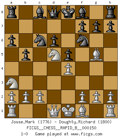 Last move : 1-0 2010 September 6 23:23:18 [Event "FICGS__CHESS__RAPID_B__000150"] [Site "FICGS"] [Date "2010.05.19"] [Round "1"] [White "Josse,Mark"] [Black "Doughty,Richard"] [Result "1-0"] [WhiteElo "1776"] [BlackElo "1800"] 1.e4 c5 2.Nf3 Nc6 3.d4 cxd4 4.Nxd4 Nf6 5.Nc3 e5 6.Ndb5 d6 7.Bg5 a6 8.Na3 b5 9.Nd5 1-0 This chess game has been lost on time (started : 2010.05.19 23:14:20) Sicilian : Pelikan (Lasker/Sveshnikov) variation Player White won this chess game. Follow this game move after move (download)Best by test: 1. e4 (Bobby Fischer) Oft bringt ein stiller Zug das Erdbeben. (Richard Reti) El Ajedrez por encima de todo... ¡es una pelea!. (Emanuel Lasker) Les Echecs sont affaire de jugement sensible. Savoir quand frapper et quand esquiver. (Fischer) . 'gn is not allowed in chess unless n is an integer between 1 and 8 inclusive, where 1 and 8 are to interpreted as the standard numerals standing for integers in the ordered real-closed field R, with the *canonical* ordering. (As opposed to, say, an integer in the domain Z[2+i*sqrt(5)] or an integer in some exotic Grothendieck topos). (Normajean Yates)