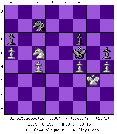Last move : 1-0 2010 July 14 21:11:10 [Event "FICGS__CHESS__RAPID_B__000150"] [Site "FICGS"] [Date "2010.05.19"] [Round "1"] [White "Benoit,Sebastien"] [Black "Josse,Mark"] [Result "1-0"] [WhiteElo "1864"] [BlackElo "1776"] 1.e4 c5 2.Nf3 e6 3.d4 cxd4 4.Nxd4 a6 5.Bd3 Bc5 6.Nb3 Be7 7.Qg4 g6 8.Qe2 d6 9.O-O Nd7 10.Nc3 Qc7 11.Bd2 b6 12.f4 Bb7 13.f5 gxf5 14.exf5 e5 15.Be4 Ngf6 16.Bxb7 Qxb7 17.Rad1 d5 18.Bg5 Rg8 19.Bh4 O-O-O 20.g3 e4 21.a4 Kb8 22.a5 b5 23.Qd2 Ka8 24.Qd4 Rg4 25.Rf2 Rdg8 26.Bxf6 Nxf6 27.Nxd5 Rd8 28.Nb6+ Ka7 29.Qxd8 Bxd8 30.Rxd8 Qc7 31.Ra8+ Kb7 32.Rc8 Qxc8 33.Nxc8 Kxc8 34.Nc5 e3 35.Rf4 Rxf4 36.gxf4 Ng4 37.c3 Kd8 38.Kg2 e2 39.Nd3 Ke7 40.h3 Ne3+ 41.Kf2 Nd5 42.Kxe2 Kf6 43.Nc5 Nc7 44.b3 Kxf5 45.Kf3 h6 46.c4 bxc4 47.bxc4 h5 48.h4 f6 49.Kg3 1-0 Sicilian : Kan, Polugaievsky variation Kingside Castling by player White (move 9) Queenside Castling by player Black (move 19) Player White won this chess game. Follow this game move after move (download)A good sacrifice is one that is not necessarily sound but leaves your opponent dazed and confused. (Rudolph Spielmann) Sitze auf Deine Hände. (Siegbert Tarrasch) El Ajedrez es en su esencia, un juego. En su forma, un arte. Y en su ejecución, una ciencia. (Baron Tassilo) Les échecs, c'est la lutte contre l'erreur. (Johannes Zukertort) Wisdom doesn't necessarily come with age. Sometimes age just shows up all by itself. (Tom Watson)