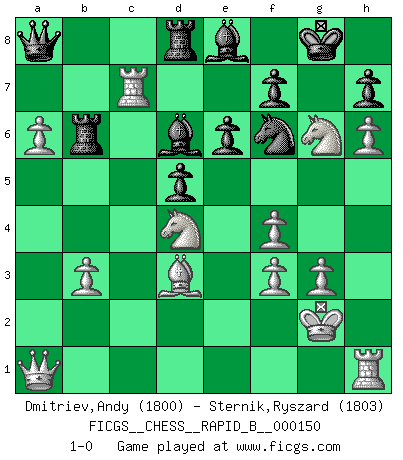 Last move : 1-0 2010 August 12 20:42:54 [Event "FICGS__CHESS__RAPID_B__000150"] [Site "FICGS"] [Date "2010.05.19"] [Round "1"] [White "Dmitriev,Andy"] [Black "Sternik,Ryszard"] [Result "1-0"] [WhiteElo "1800"] [BlackElo "1803"] 1.d4 d5 2.c4 c6 3.Nf3 Nf6 4.Nc3 a6 5.c5 Nbd7 6.Bf4 Nh5 7.e3 g6 8.h4 Nxf4 9.exf4 Bg7 10.h5 b6 11.cxb6 Qxb6 12.Qd2 Rb8 13.b3 Nf6 14.h6 Bf8 15.Rc1 e6 16.Bd3 Bd6 17.g3 Qb7 18.Qe2 Qb4 19.Kf1 c5 20.dxc5 Qxc5 21.Kg2 Qb4 22.Bxa6 O-O 23.Bd3 Bd7 24.Qb2 Qa3 25.Qa1 Be7 26.Ne5 Qa8 27.Ne2 Rfd8 28.Nd4 Rbc8 29.a4 Be8 30.a5 Bf8 31.a6 Rb8 32.f3 Rb6 33.Rc7 Bd6 34.Nxg6 1-0 QGD Slav : 4.Nc3 Kingside Castling by player Black (move 22) Player White won this chess game. Follow this game move after move (download)When you don't know what to do, wait for your opponent to get an idea - it's sure to be wrong. (Tarrasch) Um dein Spiel zu verbessern musst du zuallererst das Endspiel studieren, denn diese kann unabhängig studiert werden. Die Eröffnung und das Mittelspiel müssen immer in Bezug gesetzt werden zum Endspiel. (José Raúl Capablanca) Ciertamente el estado mental actual de Bobby Fischer es una tragedia. Uno de los mas grandes jugadores de Ajedrez del mundo -el orgullo y pena del Ajedrez Americano. (Frank Brady) Si rien de grave n'est détecté lors de l'analyse d'une position, on joue alors le coup. Seconde règle de Blumenfeld. A good programmer is someone who always looks both ways before crossing a one-way street. (Doug Linder)