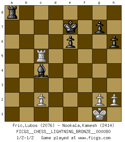 Last move : 1/2-1/2 2010 May 20 12:11:8 [Event "FICGS__CHESS__LIGHTNING_BRONZE__000080"] [Site "FICGS"] [Date "2010.05.20"] [Round "1"] [White "Fric,Lubos"] [Black "Nookala,Kamesh"] [Result "1/2-1/2"] [WhiteElo "2076"] [BlackElo "2414"] 1.e4 c5 2.Nf3 d6 3.d4 cxd4 4.Nxd4 Nf6 5.Nc3 a6 6.Bg5 e6 7.f4 Qb6 8.Qd2 Qxb2 9.Rb1 Qa3 10.e5 h6 11.Bh4 dxe5 12.fxe5 Nfd7 13.Ne4 Qxa2 14.Rd1 Qd5 15.Qe3 Qxe5 16.Be2 Bc5 17.Bg3 Qd5 18.Bf3 O-O 19.Qc3 a5 20.O-O Bxd4+ 21.Rxd4 Qb5 22.Nd6 Qc5 23.Qxc5 Nxc5 24.Rc4 Nba6 25.Bf2 Rd8 26.Nxf7 Kxf7 27.Bxc5 Nxc5 28.Bxb7 Ke7 29.Bxa8 Ba6 30.Rxc5 Bxf1 31.Rxa5 Bc4 32.Rc5 Rxa8 1/2-1/2 Sicilian : Najdorf, 7...Qb6 Kingside Castling by player Black (move 18) Kingside Castling by player White (move 20) This chess game ended in a draw. Follow this game move after move (download)It is peculiar but a fact nevertheless, that gamblers in chess always have enthusiastic followers. (Botvinnik) Ich verachte Kasparow. (Viktor Kortschnoi) Bobby es la celebridad menos entendida y malinterpretada que camina el la faz de esta tierra. (Yasser Seirawan) Nous vivons dans un monde échiquéen : chaque jour qui passe est un défi à relever. (Philosophe Sasha) That's absurd. I love it. (Gregory House, House M.D.)