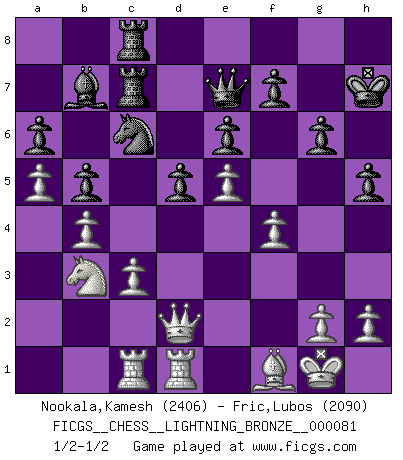 Last move : 1/2-1/2 2010 May 20 13:28:22 [Event "FICGS__CHESS__LIGHTNING_BRONZE__000081"] [Site "FICGS"] [Date "2010.05.20"] [Round "1"] [White "Nookala,Kamesh"] [Black "Fric,Lubos"] [Result "1/2-1/2"] [WhiteElo "2406"] [BlackElo "2090"] 1.e4 e6 2.d4 d5 3.Nc3 Nf6 4.e5 Nfd7 5.f4 c5 6.Nf3 Nc6 7.Be3 a6 8.Be2 Qb6 9.a3 cxd4 10.Nxd4 Bc5 11.Na4 Qa5+ 12.c3 Bxd4 13.Bxd4 Nxd4 14.Qxd4 Qc7 15.b4 O-O 16.O-O b5 17.Nb2 Bb7 18.a4 Bc6 19.a5 Rac8 20.Rac1 Bb7 21.Nd3 Qd8 22.Ne1 Nb8 23.Nf3 Nc6 24.Qe3 Rc7 25.Nd4 Qe7 26.Nb3 Rfc8 27.Bg4 g6 28.Rfd1 h5 29.Be2 Kg7 30.Bf3 Kh7 31.Qd2 Kh6 32.Qe3 Kh7 33.Be2 Kg7 34.Qd2 Kh7 35.Bf1 1/2-1/2 French : Steinitz, Boleslavsky variation Kingside Castling by player Black (move 15) Kingside Castling by player White (move 16) This chess game ended in a draw. Follow this game move after move (download)Fischer sacrificed virtually everything most of us weakies (to use his term) value, respect, and cherish, for the sake of an artful, often beautiful board game, for the ambivalent privilege of being its greatest master. (Paul Kollar) In der Schule lernt man nichts. Es ist nur Zeitverschwendung. (Robert James Fischer) Un mal plan es mejor que no tener ningún plan. (Frank Marshall) Les échecs sont utiles à l'exercice de la faculté de penser et à celle de l'imagination. Car nous devons posséder une méthode élaborée pour atteindre des buts partout où nous devons conduire notre raison. (Leibnitz) There are more things in heaven and earth than practically anywhere else. (Unknown)