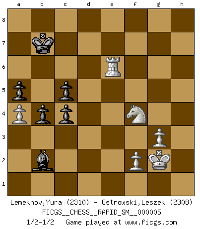 Last move : 1/2-1/2 2010 August 27 13:39:44 [Event "FICGS__CHESS__RAPID_SM__000005"] [Site "FICGS"] [Date "2010.05.20"] [Round "1"] [White "Lemekhov,Yura"] [Black "Ostrowski,Leszek"] [Result "1/2-1/2"] [WhiteElo "2310"] [BlackElo "2308"] 1.d4 d5 2.c4 c6 3.Nf3 Nf6 4.Nc3 e6 5.Bg5 dxc4 6.e4 b5 7.e5 h6 8.Bh4 g5 9.Nxg5 hxg5 10.Bxg5 Nbd7 11.g3 Bb7 12.Bg2 Qb6 13.exf6 O-O-O 14.O-O c5 15.d5 b4 16.Rb1 Qa6 17.dxe6 Bxg2 18.e7 Bxf1 19.Kxf1 Qc6 20.exd8Q+ Kxd8 21.Nd5 Rxh2 22.Kg1 Rh8 23.Rc1 Bd6 24.Bh4 Be5 25.Ne7 Qe6 26.Qf3 Kc7 27.Re1 Qd6 28.Bg5 Kb6 29.Kg2 a5 30.a4 Ka6 31.Qe4 Qe6 32.Bf4 Bxb2 33.Qxe6+ fxe6 34.Rxe6+ Kb7 35.Nf5 Nxf6 36.Nd6+ Kc6 37.Nf7 Kb7 38.Nxh8 Nd5 39.Ng6 Nxf4+ 40.Nxf4 1/2-1/2 QGD Slav : 4.Nc3 Queenside Castling by player Black (move 13) Kingside Castling by player White (move 14) Promotion Queen by player White (move 20) This chess game ended in a draw. Follow this game move after move (download)An attack on the wing should be met by play in the center. (Nimzovitch) Je mehr wir mit Computern analysieren, desto mehr glauben wir an Verteidigung. (Vladimir Kramnik) Jugadores de primera clase pierden en contra de jugadores de segunda clase porque los jugadores de segunda clase a veces juegan una partida de primer clase. (Siegbert Tarrasch) Les Echecs sont et restent toujours un combat, un combat intégral comme la boxe, la lutte ou un autre sport, et où il doit y avoir un vainqueur et un vaincu. (Joseph Emil Diemer) Success without honor is an unseasoned dish; it will satisfy your hunger, but it won't taste good. (Joe Paterno)