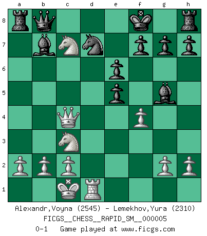 Last move : 0-1 2010 August 17 22:44:25 [Event "FICGS__CHESS__RAPID_SM__000005"] [Site "FICGS"] [Date "2010.05.20"] [Round "1"] [White "Alexandr,Voyna"] [Black "Lemekhov,Yura"] [Result "0-1"] [WhiteElo "2545"] [BlackElo "2310"] 1.e4 c5 2.Nf3 d6 3.d4 cxd4 4.Nxd4 Nf6 5.Nc3 a6 6.Bg5 e6 7.f4 Nbd7 8.Qf3 Qc7 9.O-O-O b5 10.Bxb5 axb5 11.Ndxb5 Qb8 12.e5 Bb7 13.Qe2 dxe5 14.Qc4 Be7 15.Nc7+ Kf8 16.Rxd7 Nxd7 17.Rd1 Bxg5 0-1 This chess game has been lost on time (started : 2010.05.20 21:34:1) Sicilian : Najdorf, 7.f4 Queenside Castling by player White (move 9) Player Black won this chess game. Follow this game move after move (download)Chess, like love, like music, has the power to make people happy. (Siegbert Tarrasch) Schach ist ein Reich, wo sich die menschliche Phantasie frei entfalten kann. (David Bronstein) No todos los artistas son jugadores de Ajedrez, pero todos los jugadores de Ajedrez son artistas. (Marcel Duchamp) La tactique, c'est ce que vous faites quand il y a quelque chose à faire; la stratégie, c'est ce que vous faites quand il n'y a rien à faire. (Savielli Tartacower) Chess is as much a mystery as women. (Purdy)