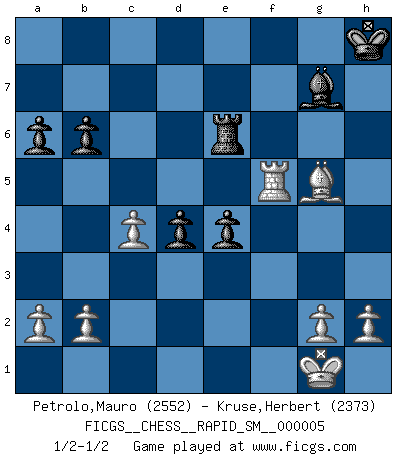 Last move : 1/2-1/2 2010 August 2 8:29:49 [Event "FICGS__CHESS__RAPID_SM__000005"] [Site "FICGS"] [Date "2010.05.20"] [Round "1"] [White "Petrolo,Mauro"] [Black "Kruse,Herbert"] [Result "1/2-1/2"] [WhiteElo "2552"] [BlackElo "2373"] 1.e4 c5 2.Nf3 d6 3.d4 cxd4 4.Nxd4 Nf6 5.Nc3 a6 6.Be3 e5 7.Nb3 Be6 8.f3 h5 9.Nd5 Bxd5 10.exd5 Nbd7 11.Qd2 g6 12.Be2 Bg7 13.O-O O-O 14.Na5 Qc7 15.c4 e4 16.f4 Ng4 17.Bxg4 hxg4 18.Rab1 b6 19.Nc6 Nb8 20.f5 Nxc6 21.dxc6 Qxc6 22.Qe2 Rad8 23.Qxg4 d5 24.fxg6 d4 25.gxf7+ Rxf7 26.Rxf7 Kxf7 27.Rf1+ Kg8 28.Bg5 Rd6 29.Qf4 Rg6 30.Qf7+ Kh8 31.Rf5 Qe6 32.Qxe6 Rxe6 1/2-1/2 Sicilian : Najdorf, Byrne (English) attack Kingside Castling by player White (move 13) Kingside Castling by player Black (move 13) This chess game ended in a draw. Follow this game move after move (download)I don't believe in psychology. I believe in good moves. (Bobby Fischer) Ein Kibitz ist einer, der deinem Gegner gute Ratschläge gibt. (Andrew Soltis) Aquellos que dicen que entienden al Ajedrez, no entienden nada. (Robert Hubner) Le génie consiste à savoir transgresser les règles au moment opportun. (Teichmann) Once you start thinking you have nothing left to learn, you have everything to learn. (Steve Badget)