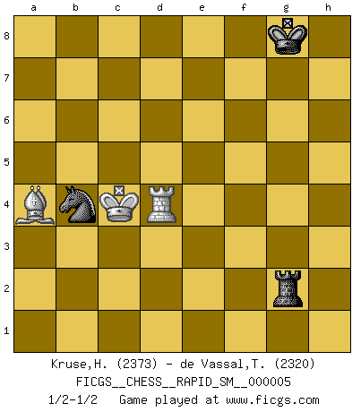 Last move : 1/2-1/2 2010 October 15 2:37:1 [Event "FICGS__CHESS__RAPID_SM__000005"] [Site "FICGS"] [Date "2010.05.20"] [Round "1"] [White "Kruse,Herbert"] [Black "de Vassal,Thibault"] [Result "1/2-1/2"] [WhiteElo "2373"] [BlackElo "2320"] 1.e4 c5 2.Nf3 d6 3.d4 cxd4 4.Nxd4 Nf6 5.Nc3 a6 6.h3 g6 7.Be3 Bg7 8.g4 O-O 9.Bg2 Nc6 10.Qd2 Nd7 11.O-O-O Nb6 12.b3 Bd7 13.f4 Rc8 14.Kb1 Nxd4 15.Bxd4 Bxd4 16.Qxd4 Qc7 17.Rd3 Qc5 18.Kb2 Bb5 19.Qxc5 Rxc5 20.Rd2 Rfc8 21.Nd1 a5 22.Ne3 a4 23.h4 Ra8 24.h5 Bc6 25.Nd5 Bxd5 26.exd5 axb3 27.axb3 Rca5 28.hxg6 hxg6 29.Be4 Nd7 30.Rdh2 Nf8 31.g5 Kg7 32.Rf2 R5a6 33.f5 Ra2+ 34.Kc3 gxf5 35.Bxf5 R2a5 36.Bd3 Ng6 37.Rfh2 Nf8 38.Re2 e6 39.dxe6 fxe6 40.Rg2 Rc5+ 41.Kb4 Rac8 42.g6 R5c7 43.Rf2 Kg8 44.c4 d5 45.cxd5 exd5 46.Rh5 Rd8 47.R2f5 Rcd7 48.Kb5 Rd6 49.Rf7 Nd7 50.Kb4 Rb6+ 51.Ka3 Nc5 52.Bc2 Ne4 53.Rfh7 Ra8+ 54.Kb2 Nf6 55.R5h6 Re8 56.Rh8+ Kg7 57.Rxe8 Kxh6 58.Re5 Rd6 59.Bf5 d4 60.Bd3 Nd5 61.Re1 Kg7 62.Rh1 b5 63.Rh7+ Kg8 64.Bxb5 Rxg6 65.Rd7 Nb4 66.Rxd4 Rg2+ 67.Kc3 Na2+ 68.Kc4 Nc1 69.b4 Na2 70.Ba4 Nxb4 1/2-1/2 Sicilian : Najdorf, Adams attack Kingside Castling by player Black (move 8) Queenside Castling by player White (move 11) 10 pieces endgame at move 57 : White KRBPP , Black KRNPP WHITE : King + 1 Rook 1 Bishop 2 Pawns BLACK : King + 1 Rook 1 Knight 2 Pawns 9 pieces endgame at move 64 : White KRBPP , Black KRNP WHITE : King + 1 Rook 1 Bishop 2 Pawns BLACK : King + 1 Rook 1 Knight 1 Pawn 8 pieces endgame at move 64 : White KRBP , Black KRNP WHITE : King + 1 Rook 1 Bishop 1 Pawn BLACK : King + 1 Rook 1 Knight 1 Pawn 7 pieces endgame at move 66 : White KRBP , Black KRN WHITE : King + 1 Rook 1 Bishop 1 Pawn BLACK : King + 1 Rook 1 Knight 6 pieces endgame at move 70 : White KRB , Black KRN WHITE : King + 1 Rook 1 Bishop BLACK : King + 1 Rook 1 Knight This chess game ended in a draw. Follow this game move after move (download)Up to this point White has been following well-known analysis. But now he makes a fatal error: he begins to use his own head. (Siegbert Tarrasch) Es gibt Leute, die glauben, alles wäre vernünftig, was man mit einem ernsthaften Gesicht tut. (Georg Christoph Lichtenberg) El sobresalir en el Ajedrez es un signo de una mente intrigante. (Sir Arthur Conan Doyle) Toutes choses étant égales, c'est la conviction qui gagne. Alliée à une volonté de vaincre, elle sert de détonateur, suscite des idées, disperse les doutes et aide à penser clairement. (Robert Fischer) There will be no order, only chaos. (Sol Robeson in Pi by Darren Aronofsky)