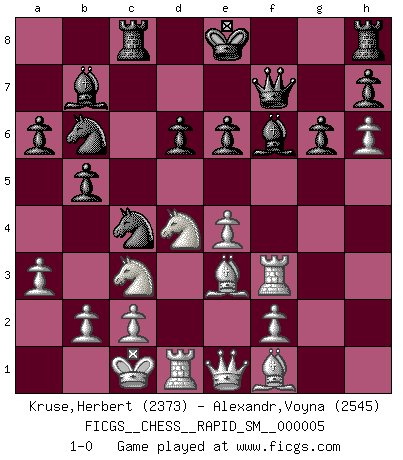 Last move : 1-0 2010 July 20 9:37:11 [Event "FICGS__CHESS__RAPID_SM__000005"] [Site "FICGS"] [Date "2010.05.20"] [Round "1"] [White "Kruse,Herbert"] [Black "Alexandr,Voyna"] [Result "1-0"] [WhiteElo "2373"] [BlackElo "2545"] 1.e4 c5 2.Nf3 d6 3.d4 cxd4 4.Nxd4 Nf6 5.Nc3 a6 6.h3 e6 7.g4 Be7 8.g5 Nfd7 9.Be3 b5 10.a3 Bb7 11.Qd2 Nb6 12.O-O-O N8d7 13.h4 Rc8 14.h5 Ne5 15.Qe1 Qc7 16.Rh3 Nec4 17.g6 Bf6 18.gxf7+ Qxf7 19.h6 g6 20.Rf3 1-0 This chess game has been lost on time (started : 2010.05.20 21:34:1) Sicilian : Najdorf, Adams attack Queenside Castling by player White (move 12) Player White won this chess game. Follow this game move after move (download)Chess is so inspiring that I do not believe a good player is capable of having an evil thought during the game. (Wilhelm Steinitz) Die unerbitterlichsten Regeln im Schach sind die Ausnahmen. (Savielly Grigorievitsch Tartakower) Una victoria por una combinación errónea, aunque sea espectacular, me llena de horror artístico. (Wilhelm Steinitz) Si rien de grave n'est détecté lors de l'analyse d'une position, on joue alors le coup. Seconde règle de Blumenfeld. Have no fear of perfection - you'll never reach it. (Salvador Dali)