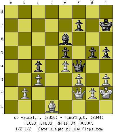 Last move : 1/2-1/2 2010 August 9 11:22:40 [Event "FICGS__CHESS__RAPID_SM__000005"] [Site "FICGS"] [Date "2010.05.20"] [Round "1"] [White "de Vassal,Thibault"] [Black "Timothy,Chan Wei Xuan"] [Result "1/2-1/2"] [WhiteElo "2320"] [BlackElo "2341"] 1.e4 c5 2.Nf3 Nc6 3.Bb5 d6 4.O-O Bd7 5.Re1 Nf6 6.c3 a6 7.Bf1 e5 8.d4 Be7 9.d5 Na7 10.a4 O-O 11.h3 b5 12.axb5 axb5 13.Nxe5 dxe5 14.d6 h6 15.dxe7 Qxe7 16.Be3 Be6 17.Qf3 c4 18.Ra6 Qb7 19.Rb6 Qc7 20.Na3 Nd7 21.Nxb5 Nxb5 22.Rxb5 Rfb8 23.Rxb8+ Rxb8 24.Re2 Ra8 25.Qg3 Kh7 26.f3 Nc5 27.Bxc5 Qxc5+ 28.Qf2 Qe7 29.Kh2 Qf6 30.Re1 Ra2 31.Rd1 g5 32.Rd6 Ra1 33.Be2 Rb1 34.Bd1 Qe7 35.Rd2 h5 36.Ba4 Qf6 37.Rd1 Rxd1 38.Bxd1 Qf4+ 1/2-1/2 Sicilian : Nimzovich-Rossolimo attack (without ...d6) Kingside Castling by player White (move 4) Kingside Castling by player Black (move 10) This chess game ended in a draw. Follow this game move after move (download)Not all artists are Chess players, but all Chess players are artists. (Marcel Duchamp) Wer sich die Fähigkeit anerziehen will im Schach selbstständig zu denken, der muß alles meiden, was leblos ist: ausgeklügelte Theorien, die sich auf sehr wenige Beispiele und eine Menge Hirngespinste stützen. (Emanuel Lasker) Los tropiezos estan todos ahí en el tablero, esperando que se cometan. (Savielly Tartakover) La menace est plus forte que l'exécution. (Aaron Nimzovitch) There are 10 types of people in this world: those who understand binary and those who don't. (Anonymous)