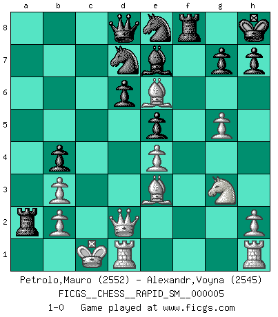 Last move : 1-0 2010 August 3 9:57:38 [Event "FICGS__CHESS__RAPID_SM__000005"] [Site "FICGS"] [Date "2010.05.20"] [Round "1"] [White "Petrolo,Mauro"] [Black "Alexandr,Voyna"] [Result "1-0"] [WhiteElo "2552"] [BlackElo "2545"] 1.e4 c5 2.Nf3 d6 3.d4 cxd4 4.Nxd4 Nf6 5.Nc3 a6 6.Be3 e5 7.Nb3 Be6 8.f3 Be7 9.Qd2 O-O 10.O-O-O Nbd7 11.g4 b5 12.g5 b4 13.Ne2 Ne8 14.f4 a5 15.f5 a4 16.fxe6 axb3 17.cxb3 fxe6 18.Bh3 Rxa2 19.Bxe6+ Kh8 20.Ng3 1-0 This chess game has been lost on time (started : 2010.05.20 21:34:1) Sicilian : Najdorf, Byrne (English) attack Kingside Castling by player Black (move 9) Queenside Castling by player White (move 10) Player White won this chess game. Follow this game move after move (download)I prefer to lose a really good game than to win a bad one. (David Levy) Karpov ist ein Museumsstück. (Garry Kasparov) El hombre es un frívolo, una creatura engañosa y como un jugador de Ajedrez, se preocupa mas por el proceso de obtener su meta que de la meta por sí misma. (Dostoyevsky) Nous vivons dans un monde échiquéen : chaque jour qui passe est un défi à relever. (Philosophe Sasha) To send light into the darkness of men's hearts - such is the duty of the artist. (Schumann)
