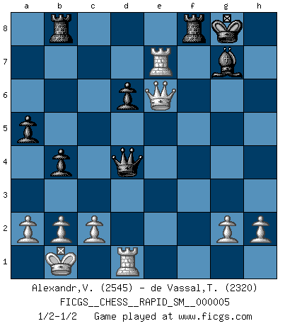Last move : 1/2-1/2 2010 July 2 11:8:30 [Event "FICGS__CHESS__RAPID_SM__000005"] [Site "FICGS"] [Date "2010.05.20"] [Round "1"] [White "Alexandr,Voyna"] [Black "de Vassal,Thibault"] [Result "1/2-1/2"] [WhiteElo "2545"] [BlackElo "2320"] 1.e4 c5 2.Nf3 d6 3.d4 cxd4 4.Nxd4 Nf6 5.Nc3 a6 6.Be3 e5 7.Nb3 Be6 8.f3 h5 9.Qd2 Nbd7 10.O-O-O Be7 11.Kb1 b5 12.Nd5 Bxd5 13.exd5 Nb6 14.Bxb6 Qxb6 15.Na5 Rc8 16.Bd3 b4 17.Nc4 Qc5 18.Ne3 a5 19.Rhe1 Nxd5 20.Nxd5 Qxd5 21.f4 Bf6 22.Qe2 Qc5 23.Bf5 Rb8 24.Qf3 O-O 25.fxe5 Bxe5 26.Qxh5 g6 27.Bxg6 fxg6 28.Qxg6+ Bg7 29.Re7 Qd4 30.Qe6+ 1/2-1/2 Sicilian : Najdorf, Byrne (English) attack Queenside Castling by player White (move 10) Kingside Castling by player Black (move 24) This chess game ended in a draw. Follow this game move after move (download)If cunning alone were needed to excel, women would be the best Chess players. (Albin) Wenn es im Universum noch irgendwo intelligente Lebewesen gibt, dann kennen sie Go. (Emanuel Lasker) El muchacho (en ese entonces un niño de 12 años llamado Anatoly Karpov) no tiene ni idea de lo que es el Ajedrez y no hay futuro en absoluto para el en esta profesión. (Mikhail Botvinnik) Les réformistes prétendent que les progrès de la théorie conduiront à la disparition des échecs, et qu'il faut, pour leur rendre vie, en remanier les règles. En réalité, qu'exprime cette affirmation? Le mépris de l'intuition, de l'imagination et de tous les autres éléments qui font des échecs un art. (Alexander Alekhine) The only thing that overcomes hard luck is hard work. (Harry Golden)