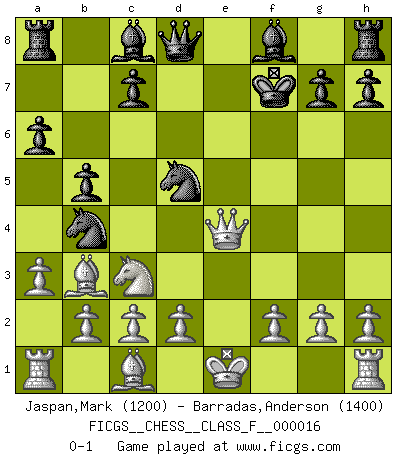 Last move : 0-1 2007 March 5 18:38:5 [Event "FICGS__CHESS__CLASS_F__000016"] [Site "FICGS"] [Date "2006.11.03"] [Round "1"] [White "Jaspan,Mark"] [Black "Barradas,Anderson"] [Result "0-1"] [WhiteElo "1200"] [BlackElo "1400"] 1.e4 e5 2.Nf3 Nc6 3.Bb5 a6 4.Ba4 b5 5.Bb3 Nf6 6.Ng5 d5 7.exd5 Nxd5 8.Nxf7 Kxf7 9.Qf3+ Ke6 10.Nc3 Ncb4 11.a3 e4 12.Qxe4+ Kf7 0-1 Ruy Lopez : Caro variation Player Black won this chess game. Follow this game move after move (download)That's what Chess is all about. One day you give your opponent a lesson, the next day he gives you one. (Bobby Fischer) Die Fehler sind da, Sie warten nur darauf gemacht zu werden. (Savielly Grigorievitsch Tartakower) Hay dos clases de hombres: aquellos que se conforman en dejarse llevar por las circunstancias y que juegan barajas y aquellos decididos a controlar las circunstancias y que juegan al Ajedrez. (Mortimer Collins) Un journaliste : 'Vous préférez avoir une dame de plus sur l'échiquier ou au lit ?' Boris Spassky : 'Ca dépend de la position.' For peace of mind, resign as general manager of the universe. (Douglas Adams)