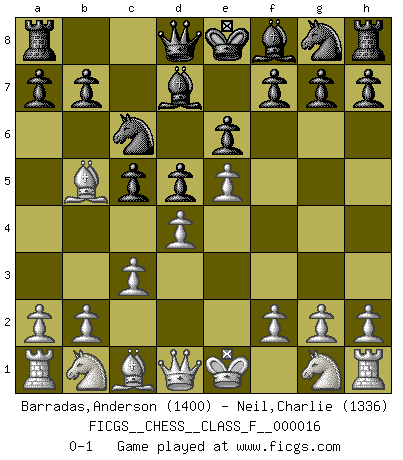 Last move : 0-1 2006 December 18 0:49:43 [Event "FICGS__CHESS__CLASS_F__000016"] [Site "FICGS"] [Date "2006.11.03"] [Round "1"] [White "Barradas,Anderson"] [Black "Neil,Charlie"] [Result "0-1"] [WhiteElo "1400"] [BlackElo "1336"] 1.e4 e6 2.d4 d5 3.e5 c5 4.c3 Nc6 5.Bb5 Bd7 0-1 This chess game has been lost on time (started : 2006.11.03 0:13:50) French : Advance variation Player Black won this chess game. Follow this game move after move (download)A man without frontiers. He didn't divide the East and the West, he brought them together in their admiration for him. (Ljubomir Ljubojevic, about Bobby Fischer's death) Ich bin es gewohnt, das die Jugend mir überhaupt keinen Respekt entgegenbringt. (Alexander Morozewich) Cada Peón es potencialmente una Reina. (James Mason) Les échecs, c'est la lutte contre l'erreur. (Johannes Zukertort) I believe in luck. How else can you explain the success of those you dislike ? (Jean Cocteau)