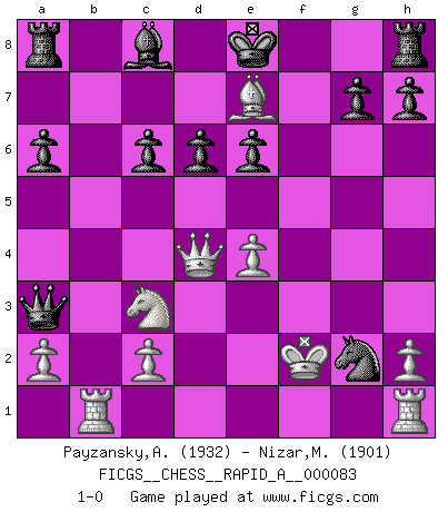 Last move : 1-0 2010 July 12 21:25:8 [Event "FICGS__CHESS__RAPID_A__000083"] [Site "FICGS"] [Date "2010.05.21"] [Round "1"] [White "Payzansky,Aleksey"] [Black "Nizar,Muhammad"] [Result "1-0"] [WhiteElo "1932"] [BlackElo "1901"] 1.e4 c5 2.Nf3 d6 3.d4 cxd4 4.Nxd4 Nf6 5.Nc3 a6 6.Bg5 e6 7.f4 Qb6 8.Qd3 Qxb2 9.Rb1 Qa3 10.f5 Nc6 11.fxe6 fxe6 12.Nxc6 bxc6 13.Be2 Be7 14.Bh5+ Nxh5 15.Bxe7 Nf4 16.Qd4 Nxg2+ 17.Kf2 1-0 This chess game has been lost on time (started : 2010.05.21 14:49:22) Sicilian : Najdorf, 7...Qb6 Player White won this chess game. Follow this game move after move (download)The laws of Chess do not permit a free choice: you have to move whether you like it or not. (Emanuel Lasker) Schach ist ein schwarz-weisser Dschungel. (Garry Kasparov) Del Ajedrez se ha dicho que la vida no es lo suficientemente larga para él, pero eso es culpa de la vida, no del Ajedrez. (William Ewart Napier) Ce n'est pas pour s'amuser qu'il joue aux échecs : il célèbre un culte. (Vladimir Nabokov) It is the aim of the modern school, not to treat every position according to one general law, but according to the principle inherent in the position. (Richard Reti)
