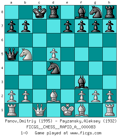 Last move : 1-0 2010 May 24 17:4:29 [Event "FICGS__CHESS__RAPID_A__000083"] [Site "FICGS"] [Date "2010.05.21"] [Round "1"] [White "Panov,Dmitriy"] [Black "Payzansky,Aleksey"] [Result "1-0"] [WhiteElo "1995"] [BlackElo "1932"] 1.e4 c5 2.c3 d5 3.exd5 Qxd5 4.d4 cxd4 5.cxd4 Nc6 6.Nf3 Bg4 7.Nc3 Qa5 8.d5 O-O-O 9.Bd2 Nd4 10.Nb5 Bxf3 11.Qc1+ 1-0 Sicilian : Alapin's variation (2.c3) Queenside Castling by player Black (move 8) Player White won this chess game. Follow this game move after move (download)It is always better to sacrifice your opponent's men. (Savielly Tartakower) Ich war zu klein für die Schach-Schülermannschaft! (Woody Allen) Haz el enroque temprano y seguido. (Rob Sillars) Vous savez, camarade Pachman, je n'éprouve pas de plaisir à être ministre, je jouerais plutôt aux échecs comme vous, ou alors ferais une révolution au Venezuela. (Che Guevara à Ludek Pachman, 'Checkmate in Prague', 1975) The Internet is the first thing that humanity has build that humanity doesn't understand, the largest experiment in anarchy that we have ever had. (Eric Schmidt)