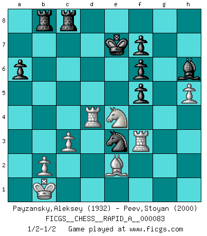Last move : 1/2-1/2 2010 June 29 7:13:8 [Event "FICGS__CHESS__RAPID_A__000083"] [Site "FICGS"] [Date "2010.05.21"] [Round "1"] [White "Payzansky,Aleksey"] [Black "Peev,Stoyan"] [Result "1/2-1/2"] [WhiteElo "1932"] [BlackElo "2000"] 1.e4 c5 2.Nf3 e6 3.d4 cxd4 4.Nxd4 Nf6 5.Nc3 d6 6.g4 h6 7.g5 hxg5 8.Bxg5 Nc6 9.Qd2 Qb6 10.Nb3 a6 11.O-O-O Qc7 12.h4 b5 13.a3 Rb8 14.Kb1 b4 15.axb4 Rxb4 16.f3 Rb8 17.Be2 Nb4 18.Rhg1 Bd7 19.f4 Bc6 20.Bxf6 gxf6 21.h5 Bh6 22.Rgf1 d5 23.Nd4 dxe4 24.Nxc6 Qxc6 25.Qd4 Ke7 26.f5 Rhd8 27.Qxe4 Qxe4 28.Nxe4 Nd5 29.Rf3 Rdc8 30.Rd4 Ne3 31.c3 exf5 1/2-1/2 Sicilian : Anderssen variation Queenside Castling by player White (move 11) This chess game ended in a draw. Follow this game move after move (download)Chess opens and enriches your mind. (Saudin Robovic) Fischer: 'Remis!?' Uhlmann: 'Aber es muss doch dreimal Zugwiederholung sein!' Fischer: 'Sie nehmen das Remis an, wie ich es sage, sonst spiele ich weiter und werde Sie dann schlagen!' (Robert James Fischer) Uno por uno, yo los acribillé, mi superioridad muy pronto se volvio aparente. (Jose Capablanca) Mais l'homme est une créature légère et illogique : semblable au joueur d'échecs, il n'aime que le processus du but à atteindre, non le but lui-même. (Dostoïevsky) Luck is the residue of design. (John Milton)