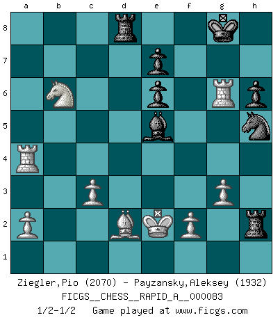 Last move : 1/2-1/2 2010 July 1 20:46:40 [Event "FICGS__CHESS__RAPID_A__000083"] [Site "FICGS"] [Date "2010.05.21"] [Round "1"] [White "Ziegler,Pio"] [Black "Payzansky,Aleksey"] [Result "1/2-1/2"] [WhiteElo "2070"] [BlackElo "1932"] 1.d4 Nf6 2.c4 g6 3.Nc3 d5 4.cxd5 Nxd5 5.e4 Nxc3 6.bxc3 Bg7 7.Nf3 c5 8.Rb1 O-O 9.Be2 b6 10.O-O Bb7 11.Qd3 Ba6 12.Qe3 Qd7 13.dxc5 Bxe2 14.Qxe2 bxc5 15.Rd1 Qa4 16.Rb3 Nd7 17.Ra3 Qc6 18.Bg5 h6 19.Bf4 c4 20.e5 a5 21.e6 Qxe6 22.Qxe6 fxe6 23.Be3 Rfd8 24.Kf1 a4 25.Rb1 Ne5 26.Nd2 Ng4 27.Nxc4 Nxh2+ 28.Ke2 Ng4 29.Bd2 Nf6 30.Nb6 Ra5 31.Rb4 Rh5 32.R3xa4 Rh2 33.g3 Nh5 34.Rg4 Be5 35.Rxg6+ 1/2-1/2 King's Indian defense, 3.Nc3 Kingside Castling by player Black (move 8) Kingside Castling by player White (move 10) This chess game ended in a draw. Follow this game move after move (download)Chess makes man wiser and clear-sighted. (Vladimir Putin) Es ist peinlich, dass ich nie Weltmeister wurde. Es wäre leicht, Leonid Breschnjew als Ursache vorzuschieben, dessen Apparat den Vorzeigekommunisten Anatoli Karpow in allem unterstützte. Aber Garri Kasparow zum Beispiel, der ebenfalls von den Sowjets unerwünscht war, hat trotz der Widerstände den WM-Titel erobert. (Viktor Kortschnoi) Fischer es el jugador mas fuerte del mundo. De hecho, el jugador mas fuerte que jamas haya existido. (Larry Evans) La victoire dans une partie d'Echecs appartient la plupart du temps à celui qui voit un peu plus loin que l'adversaire. (Lasker) Luck is what you have left over after you give 100 percent. (Langston Coleman)