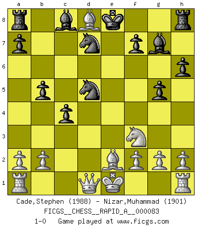 Last move : 1-0 2010 July 11 21:25:30 [Event "FICGS__CHESS__RAPID_A__000083"] [Site "FICGS"] [Date "2010.05.21"] [Round "1"] [White "Cade,Stephen"] [Black "Nizar,Muhammad"] [Result "1-0"] [WhiteElo "1988"] [BlackElo "1901"] 1.d4 d5 2.c4 c6 3.Nf3 Nf6 4.Nc3 e6 5.Bg5 h6 6.Bh4 g5 7.Bg3 dxc4 8.e4 b5 9.Be2 Nbd7 10.d5 cxd5 11.exd5 exd5 12.Nxd5 Bg7 13.Bc7 Nxd5 14.Bxd8 1-0 This chess game has been lost on time (started : 2010.05.21 14:49:22) QGD Slav : 4.Nc3 Player White won this chess game. Follow this game move after move (download)For me, Chess is life and every game is like a new life. Every Chess player gets to live many lives in one lifetime. (Eduard Gufeld) Du kannst im Schach nur gut werden, wenn du das Spiel liebst. (Robert James Fischer) No solamente yo pronostico su triunfo sobre Botvinnik, sino que me adelanto y digo que probablemente Fischer es el jugador de Ajedrez mas grande que haya existido. (John Collins) Les écrivains ont utilisé les échecs pour analyser les côtés extrêmes de la nature humaine. Dans ce cadre, les échecs offrent un champ d'expérimentation idéal. Mais on pourrait faire la même chose avec la peinture. Et là, en vous référant à Van Gogh, vous ne tirerez pas de conclusion définitive sur les peintres. (Gary Kasparov) I don't believe in psychology. I believe in good moves. (Bobby Fischer)