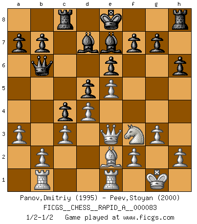 Last move : 1/2-1/2 2010 June 7 10:21:40 [Event "FICGS__CHESS__RAPID_A__000083"] [Site "FICGS"] [Date "2010.05.21"] [Round "1"] [White "Panov,Dmitriy"] [Black "Peev,Stoyan"] [Result "1/2-1/2"] [WhiteElo "1995"] [BlackElo "2000"] 1.e4 c5 2.c3 e6 3.d4 d5 4.e5 Nc6 5.Nf3 Qb6 6.a3 c4 7.Nbd2 Na5 8.Be2 Bd7 9.O-O Rc8 10.Re1 Ne7 11.Qc2 Nf5 12.Nf1 h6 13.Ne3 Nb3 14.Rb1 Nxc1 15.Qxc1 Nxe3 16.Qxe3 Be7 17.g3 1/2-1/2 Sicilian : Alapin's variation (2.c3) Kingside Castling by player White (move 9) This chess game ended in a draw. Follow this game move after move (download)Many have become Chess Masters, no one has become the Master of Chess. (Siegbert Tarrasch) Rubinstein ist ein Turmendspiel, welches die Götter vor tausenden von Jahren begannen. (Savielly Grigorievitsch Tartakower) El Ajedrez es el juego mas altamente simbólico, pero las agresiones estan por lo tanto aún mas francamente representadas en la partida. Tal vez comenzo como un juego de guerra; Algo como la representación de una batalla en miniatura entre las fuerzas de dos reinos. (Karl Meninger) Il vaut toujours mieux jouer un plan faux de façon logique que de n'avoir pas de plan du tout. (Victor Kortchnoï) Establishing goals is all right if you don't let them deprive you of interesting detours. (Doug Larson)