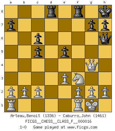Last move : 1-0 2006 November 18 22:45:0 [Event "FICGS__CHESS__CLASS_F__000016"] [Site "FICGS"] [Date "2006.11.03"] [Round "1"] [White "Arteau,Benoit"] [Black "Caburro,John"] [Result "1-0"] [WhiteElo "1336"] [BlackElo "1461"] 1.d4 c5 2.d5 e5 3.dxe6 fxe6 4.Nc3 d5 5.Nf3 Nf6 6.Bg5 Be7 7.e3 O-O 8.Bd3 Nc6 9.O-O e5 10.Bxf6 Bxf6 11.Nxd5 Bg4 12.Nxf6+ Qxf6 13.Be4 Rad8 14.Qe2 Qh6 15.Qc4+ Kh8 16.Bxc6 bxc6 17.Qxg4 1-0 Old Benoni defense Kingside Castling by player Black (move 7) Kingside Castling by player White (move 9) Player White won this chess game. Follow this game move after move (download)Your body has to be in top condition. Your Chess deteriorates as your body does. You can't separate body from mind. (Bobby Fischer) Ich las kürzlich ein Buch von Nietzsche. Er sagte Religion verdumme nur die Menschen. Ich stimme zu. (Robert James Fischer) Cuando tu no sabes absolutamente que mas hacer, es tiempo de entrar en pánico. (John van der Wiel) Les Cavaliers se révèlent fort utiles dans les positions fermées. D'habitude, les Fous sont un peu plus forts que les Cavaliers dans les positions ouvertes. Qu'on le veuille ou non, il restera toujours des exceptions ! The worth of a book is to be measured by what you can carry away from it. (James Bryce)