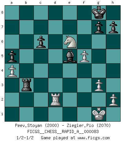 Last move : 1/2-1/2 2010 July 4 11:33:15 [Event "FICGS__CHESS__RAPID_A__000083"] [Site "FICGS"] [Date "2010.05.21"] [Round "1"] [White "Peev,Stoyan"] [Black "Ziegler,Pio"] [Result "1/2-1/2"] [WhiteElo "2000"] [BlackElo "2070"] 1.c4 Nf6 2.Nc3 e5 3.Nf3 Nc6 4.g3 d5 5.cxd5 Nxd5 6.Bg2 Nb6 7.O-O Be7 8.d3 O-O 9.a3 Be6 10.Be3 f5 11.Rc1 a6 12.Na4 e4 13.Ne1 Nd5 14.dxe4 Nxe3 15.Qxd8 Raxd8 16.fxe3 Bg5 17.Rc3 Bf6 18.Nc5 Bc8 19.Rd3 Ne5 20.Rxd8 Rxd8 21.exf5 Rd2 22.Ned3 Rxe2 23.Nxe5 Bxe5 24.Bxb7 Bxb7 25.Nxb7 Rxe3 26.Rf2 Rb3 27.Nc5 Rb5 28.Ne6 a5 29.a4 Rb4 30.b3 Rxb3 31.Rd2 c6 1/2-1/2 English Opening Kingside Castling by player White (move 7) Kingside Castling by player Black (move 8) This chess game ended in a draw. Follow this game move after move (download)Chess is everything: art, science and sport. (Anatoly Karpov) Wenn ich Weiß habe gewinne ich weil ich Weiß habe, wenn ich Schwarz habe gewinne ich weil ich Bogoljubov bin. (Efim Bogoljubov) Si no le temes a Spassky, entonces elimino el elemento del dinero. (Jim Slater) On entre au jeu d'Echecs comme on entre en Religion. Pour le joueur d'Echecs, la partie d'Echecs c'est l'office, la messe, le défilé du 1er Mai, le dépôt de gerbe au Monument aux Morts. C'est un drame sacré. (Michel Roos) See no evil, hear no evil, speak no evil. (The 3 monkeys)