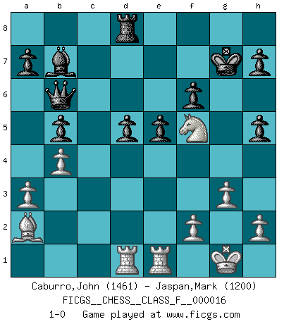 Last move : 1-0 2007 February 14 4:15:38 [Event "FICGS__CHESS__CLASS_F__000016"] [Site "FICGS"] [Date "2006.11.03"] [Round "1"] [White "Caburro,John"] [Black "Jaspan,Mark"] [Result "1-0"] [WhiteElo "1461"] [BlackElo "1200"] 1.e4 c5 2.a3 g6 3.d4 cxd4 4.Qxd4 Nf6 5.e5 Nc6 6.Qd1 Qa5+ 7.Nc3 Qxe5+ 8.Be2 Bg7 9.Nf3 Qb8 10.O-O O-O 11.Re1 Rd8 12.Bc4 d5 13.Ba2 e6 14.g3 b5 15.Bf4 Qb6 16.Qe2 Ba6 17.b4 Rac8 18.Nd1 Nh5 19.Be5 Nxe5 20.Nxe5 Bxe5 21.Qxe5 Rxc2 22.Ne3 f6 23.Qxh5 gxh5 24.Nxc2 Kg7 25.Rad1 Bb7 26.Nd4 e5 27.Nf5+ 1-0 Sicilian defense Kingside Castling by player White (move 10) Kingside Castling by player Black (move 10) Player White won this chess game. Follow this game move after move (download)The game of Chess is not merely an idle amusement; several very valuable qualities of the mind are to be acquired and strengthened by it, so as to become habits ready on all occasions; for life is a kind of Chess. (Benjamin Franklin) Ich habe Kasparov in Rente geschickt. (Veselin Topalov) El Jaque al descubierto es el bombardero del tablero. (Reuben Fine) Un footballeur joue avec ses pieds, parfois avec sa tête. Un joueur d'échecs ne joue qu'avec sa tête. Et quand il ne joue plus, il meurt. (Jacob Murray) Players are not good because they find tactics, it is about the way to find the positions in which those tactics are hidden. (Luc-Olivier Leclerc)